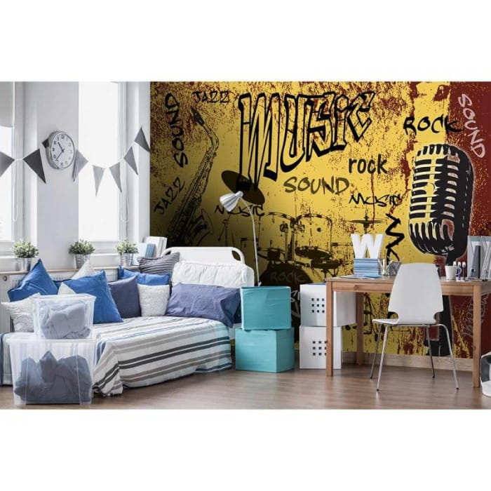 Fototapeta na flizelinie "Music Orange" to kolejny przepis na modny wystrój dziecięcego wnętrza. Nowoczesna grafika przywołująca na myśl street-art świetnie będzie współgrać również w młodzieżową, szczególnie chłopięcą stylistyką. Wzór przedstawiający czarne graffiti w stylu "Music", "Rock", "Sound" i "Jazz" i rysunki przedstawiające perkusję, mikrofon i saksofon, z pewnością przypadnie do gustu wszystkim, młodym melomanom. Kompozycję ożywia i ociepla żółto-czerwone tło. Zachęcamy do zapoznania się z drugą wersją wzoru, czyli fototapetą "Music Blue".