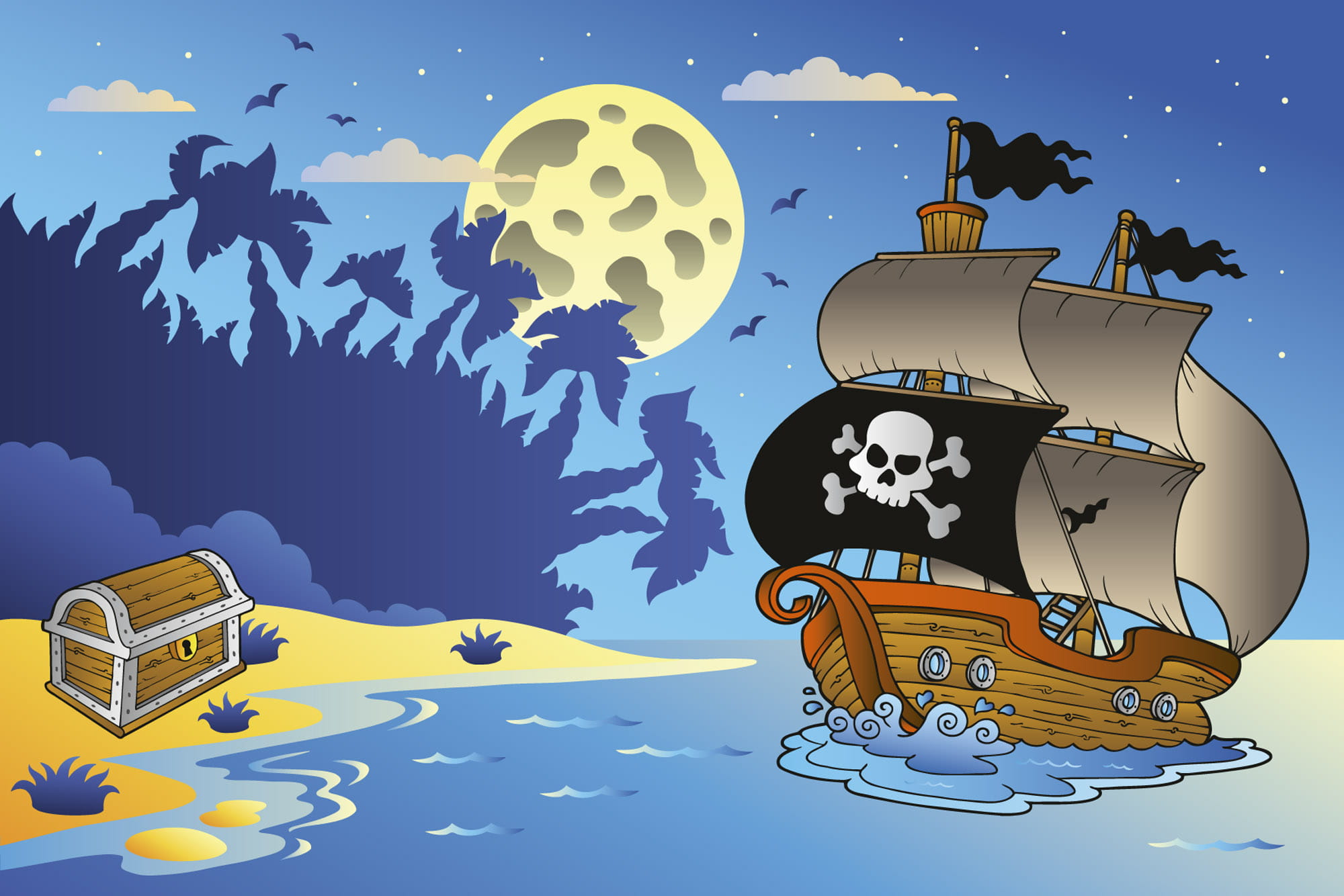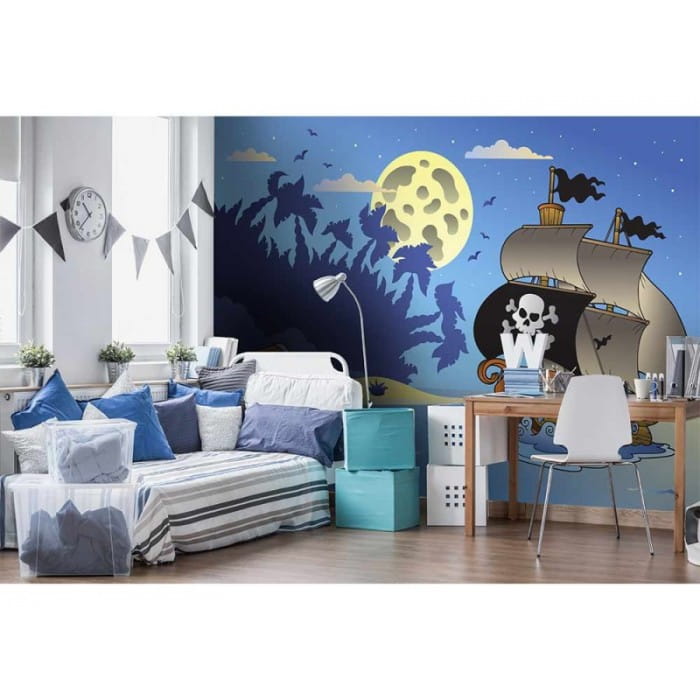 Fototapeta na flizelinie "Pirate Ship" to propozycja na wystrój pokoiku małego pirata i odkrywcy. Statek piratów już dobija do wymarzonej wyspy skarbów. Cień palmowych drzew, księżyc w pełni i gwieździste niebo, po którym latają nietoperze tworzą tajemniczą scenerię. W kompozycji przeważa kolor niebieski, który będzie sprzyjał wyciszeniu dziecka.