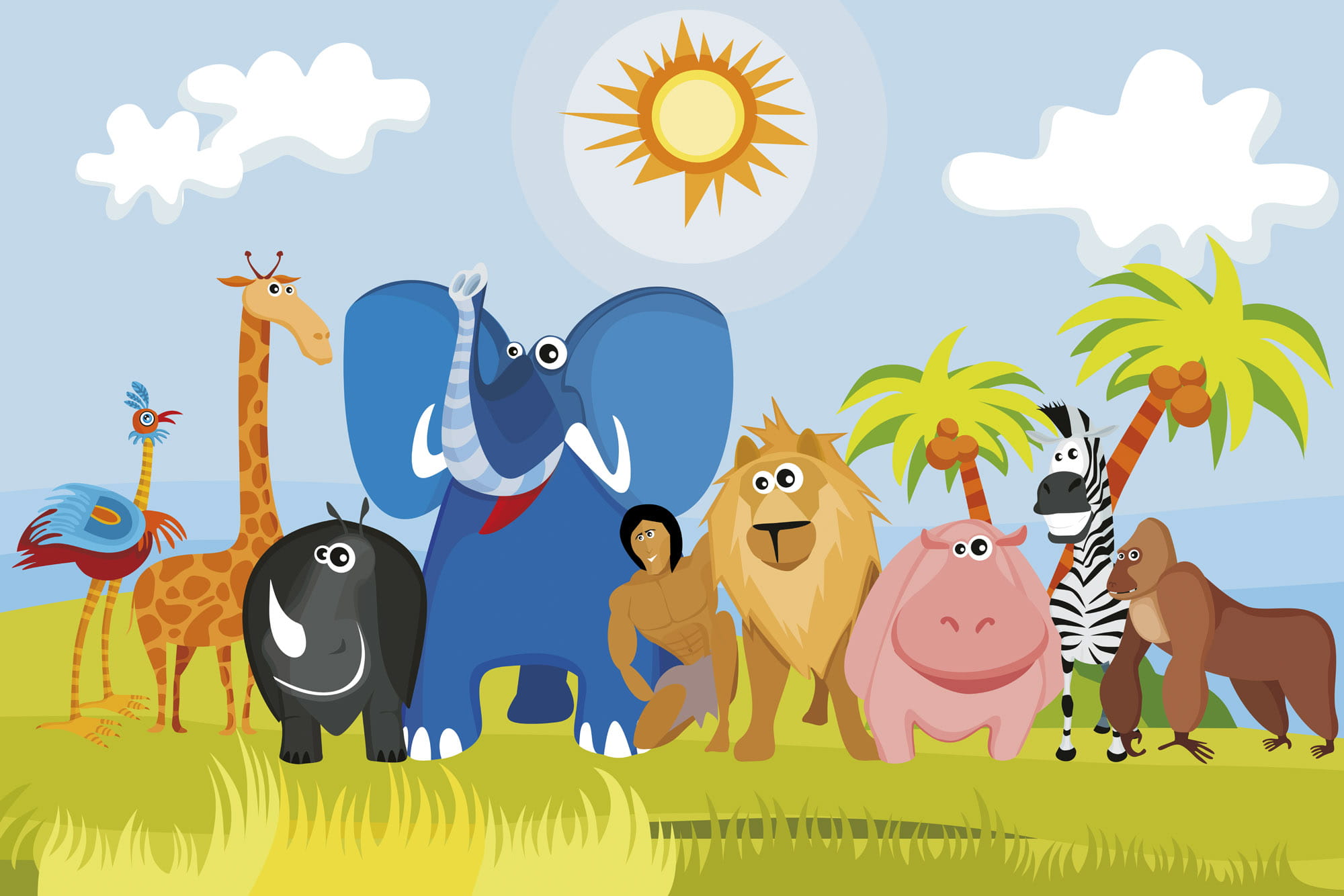 Kolorowa fototapeta dla dzieci "Africa Animals" zabierze Twoje dziecko do świata dżungli. Słoń, żyrafa, nosorożec i hipopotam, to tylko niektóre ze zwierząt ukazanych na ilustracji...o i jest jeszcze Tarzan! Fototapeta przedstawiająca egzotyczne zwierzątka wniesie optymistyczny nastrój zarówno do pokoju dziewczynki, jak i chłopca.
