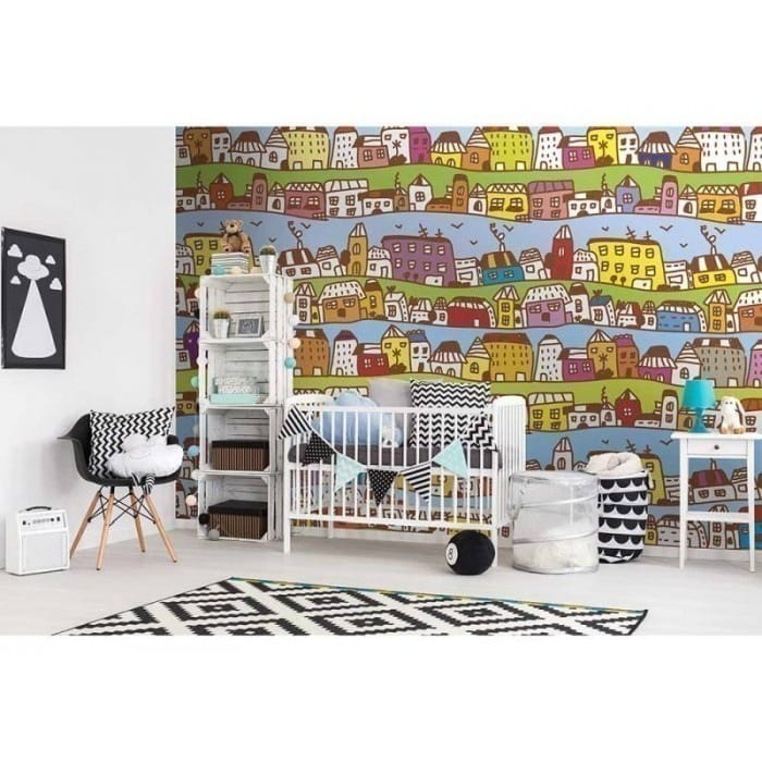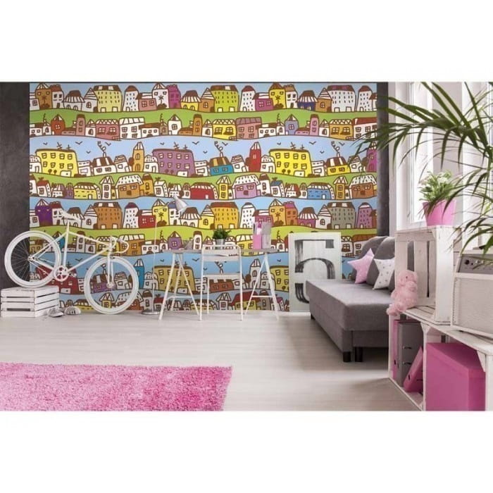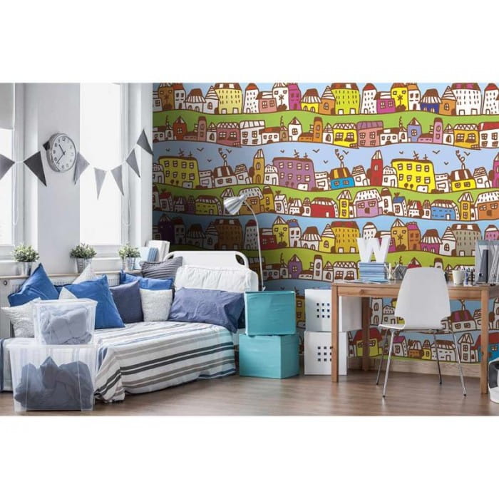 Fototapeta w kolorowe domki będzie optymistycznym dodatkiem do pokoju dziecka. Barwna grafika urozmaici wystrój zarówno pokoju chłopca, jak i dziewczynki.