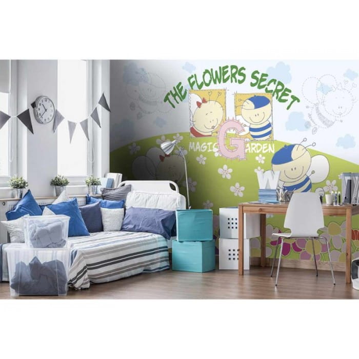 Fototapeta na flizelinie w pszczółki wniesie radosną atmosferę do pokoju dziecka i wzbudzi zachwyt w najmłodszych. Kolorowa grafika, uzupełniona o motywy kwiatowe i napisy będzie pasować zarówno do pokoju chłopca, jak i dziewczynki.
