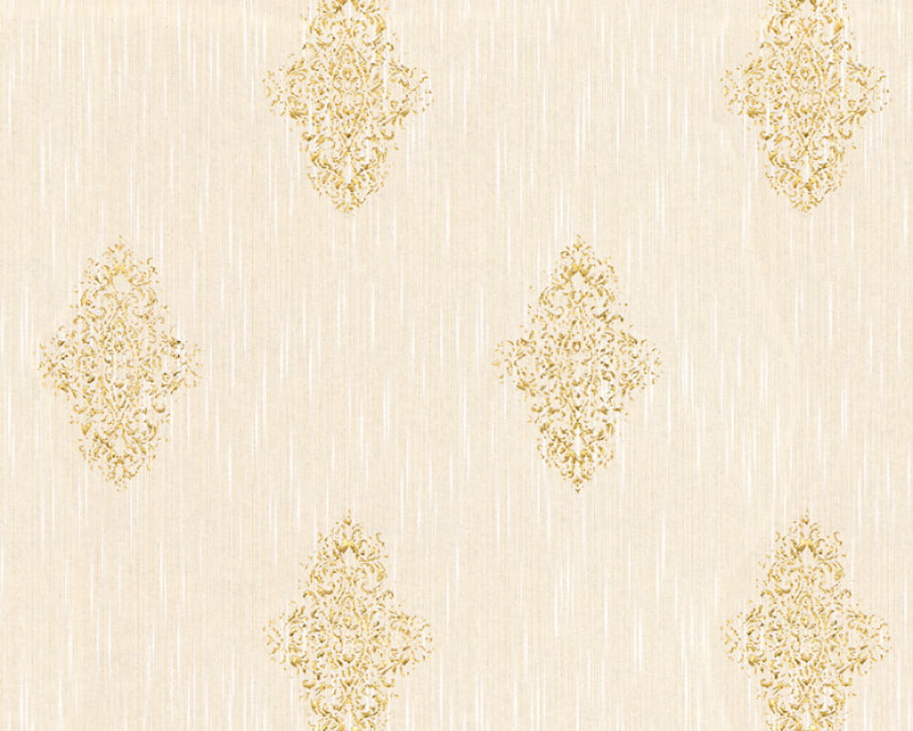 Ekskluzywna tapeta ścienna z kolekcji "Luxury Wallpaper", opracowanej przez Architects Paper, producenta AS Creation. Motyw tapety tworzą klasyczne ornamenty wkomponowane w tekstylne, jedwabiste tło. Wzór jest złoty, mocno metalizowany, tło zachowano w delikatnej tonacji ciepłego kremu, jest niezwykle przyjemne, aksamitne w dotyku, charakteryzują je delikatne, pionowo ułożone nici osnowy, miejscami lekko rozjaśnione i wzmocnione o subtelne, świetliste refleksy. Wysoce wyselekcjonowana ozdoba na ścianę, która zadowoli najbardziej wyszukane i wymagające gusta, dzięki niej aranżacja nabierze luksusowego charakteru. Tapeta wpasuje się zarówno w stylowe, jak i nowoczesne aranżacje wnętrz, pasuje do salonu, jadalni, sypialni czy też przedpokoju, ze względu na swój stylowy charakter, dopełni się również w miejscach użyteczności publicznej, jak hotele, pensjonaty, restauracje, biura itp. Wzór pięknie sprawdzi się w postaci dekoracji jednej ściany, w połączeniu z dopasowanymi tapetami z kolekcji: 9651-27 i 31945-2. Struktura tapety delikatnie tłoczona, tło jest matowe, z wyjątkiem nici wzmocnionych o delikatne, świetliste refleksy, wzór jest nieco wklęsły i pięknie połyskuje metaliczną poświatą. Podłoże tapety tekstylne, winylowe na flizelinie, odporne na zmywanie, kolory nie tracą nasycenia pod wpływem działania promieni słonecznych. Nasz sklep internetowy posiada inne, ekskluzywne tapety ścienne z kolekcji Luxury Wallpaper, zapraszamy na zakupy online.