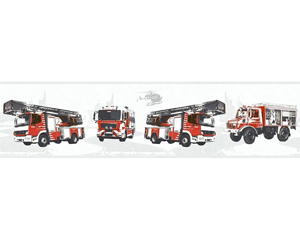 Dekoracyjny pasek ścienny producenta AS Creation z kolekcji "Little Stars". Border przedstawiający wozy strażackie i helikoptery z pewnością przypadnie do gustu chłopcom. W tle pojazdów pożarniczych widać delikatny zarys dróg i bloków. Ubarwienie wzoru utrzymano w odcieniach szarości, w kolorze białym i w ożywiającej całość czerwieni, tło jest białe. Delikatnie tłoczona struktura tapety imituje płótno, wykończenie jest matowe. Dekoracja, która w wyjątkowy sposób podkreśli charakter dziecięcej aranżacji, może być stosowana na wiele sposobów; według uznania pasek można połączyć z jednobarwnym tłem, wzorem, czy też zastosować jako łączenie dwóch tapet. Pasek na podłożu flizelinowym, zmywalny, odporny na działania promieni słonecznych.