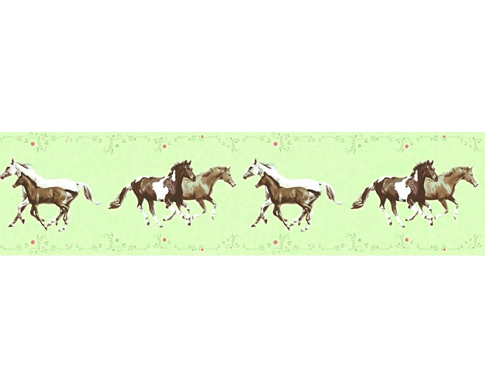 Dekoracyjny pasek ścienny producenta AS Creation z kolekcji "Little Stars". Motyw przedstawiający koniki pomoże zaaranżować wyjątkowo przytulne, dziecięce wnętrze, z pewnością przypadnie do gustu dziewczynkom. Pastelowe, zielono-pistacjowe tło wypełniają galopujące parami konie, charakteryzujące się brązowym i białym umaszczeniem. Brzegi paska zdobi drobniutki, zielony ornament, który przyciąga wzrok delikatnym, metalicznym połyskiem, gdzieniegdzie zdobią go drobniutkie kropki, utrzymane w dwóch odcieniach różu. Dekoracja na ścianę, która w wyjątkowy sposób podkreśli charakter dziecięcej aranżacji, może być stosowana na wiele sposobów; według uznania pasek można połączyć z jednobarwnym tłem, wzorem, czy też zastosować jako łączenie dwóch tapet. Powierzchnia tapety bardzo delikatnie, jednolicie tłoczona, imituje płótno, wykończenie jest matowe. Pasek na podłożu flizelinowym, zmywalny, odporny na działania promieni słonecznych. W rzeczywistości zielone tło ma spokojniejszy odcień niż przedstawia zdjęcie.