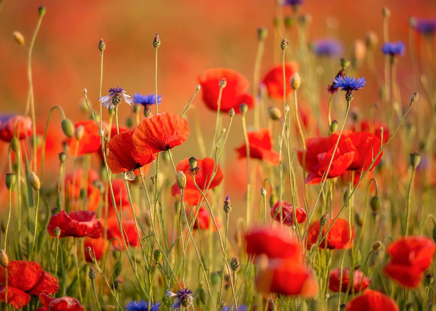 Kolorystyka fototapety jest żywa i ciepła, z wyrazistą czerwienią maków kontrastującą z chłodnym błękitem chabrów i złocistymi tonami tła. Jasne, słoneczne refleksy rozświetlają całą scenę, nadając jej głębi. Tło w ciepłych odcieniach pomarańczowego subtelnie dopełnia kompozycję, dodając całości przytulnego charakteru.