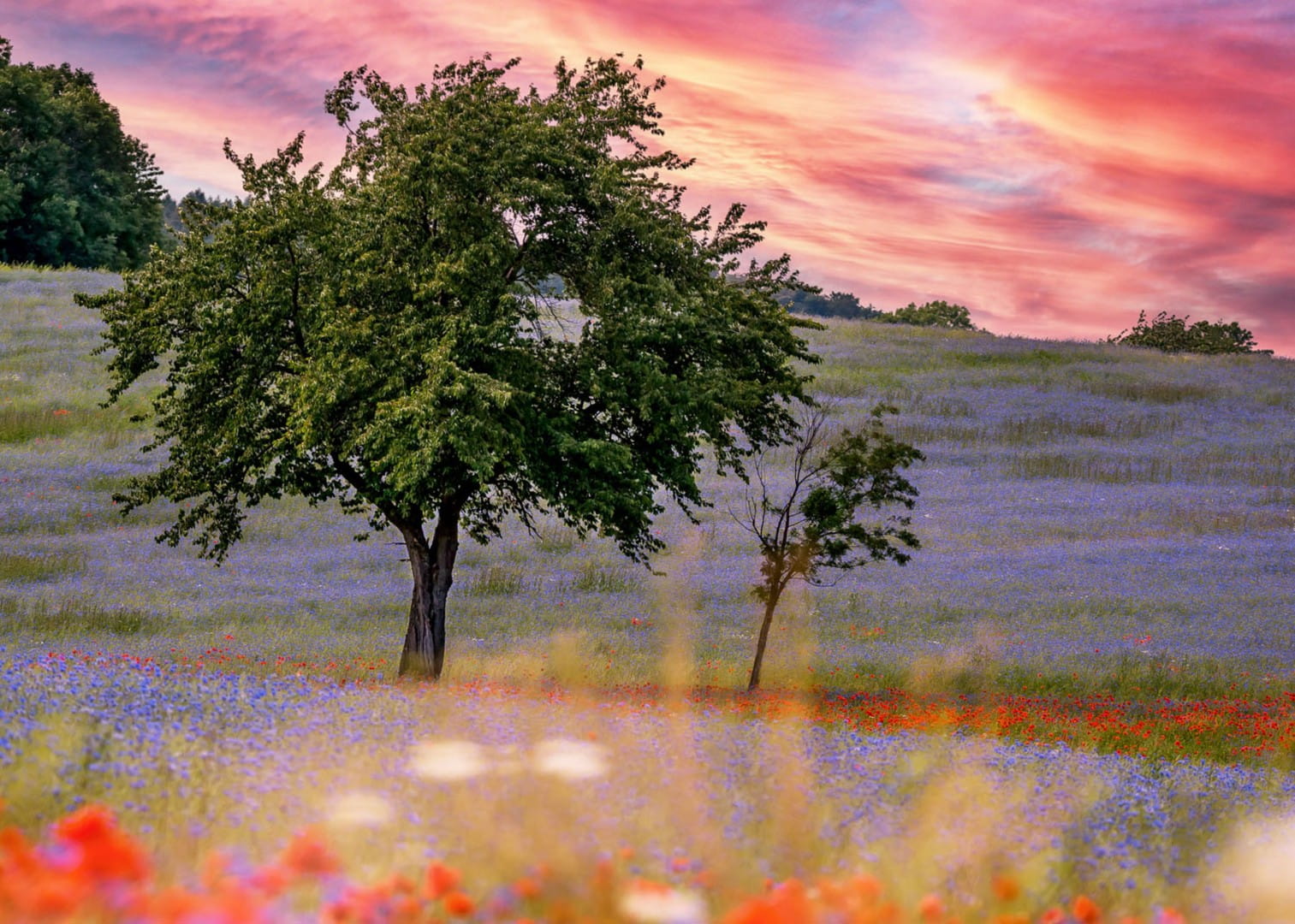 Kolorystyka fototapety jest bogata i harmonijna. Ciepłe odcienie różu, pomarańczowego i fioletu na niebie kontrastują z zielenią trawy oraz subtelnymi tonami ziemi. Pastelowe, świetliste akcenty na pierwszym planie w postaci dodają scenerii delikatności.