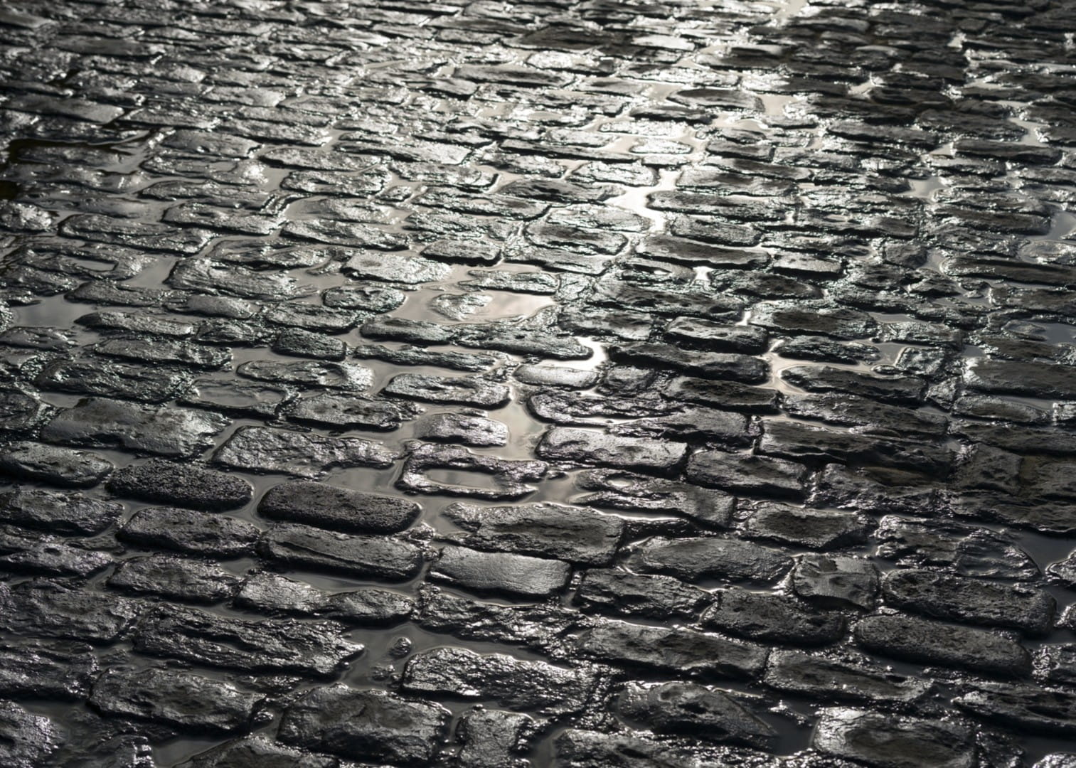 Kolorystyka fototapety opiera się na ciemnych odcieniach szarości, grafitu i antracytu, które zostały uzupełnione jasnymi akcentami imitującymi odbicia światła na mokrej powierzchni. Taka paleta barw podkreśla industrialny charakter dekoracji, wprowadzając do wnętrza elegancką surowość.