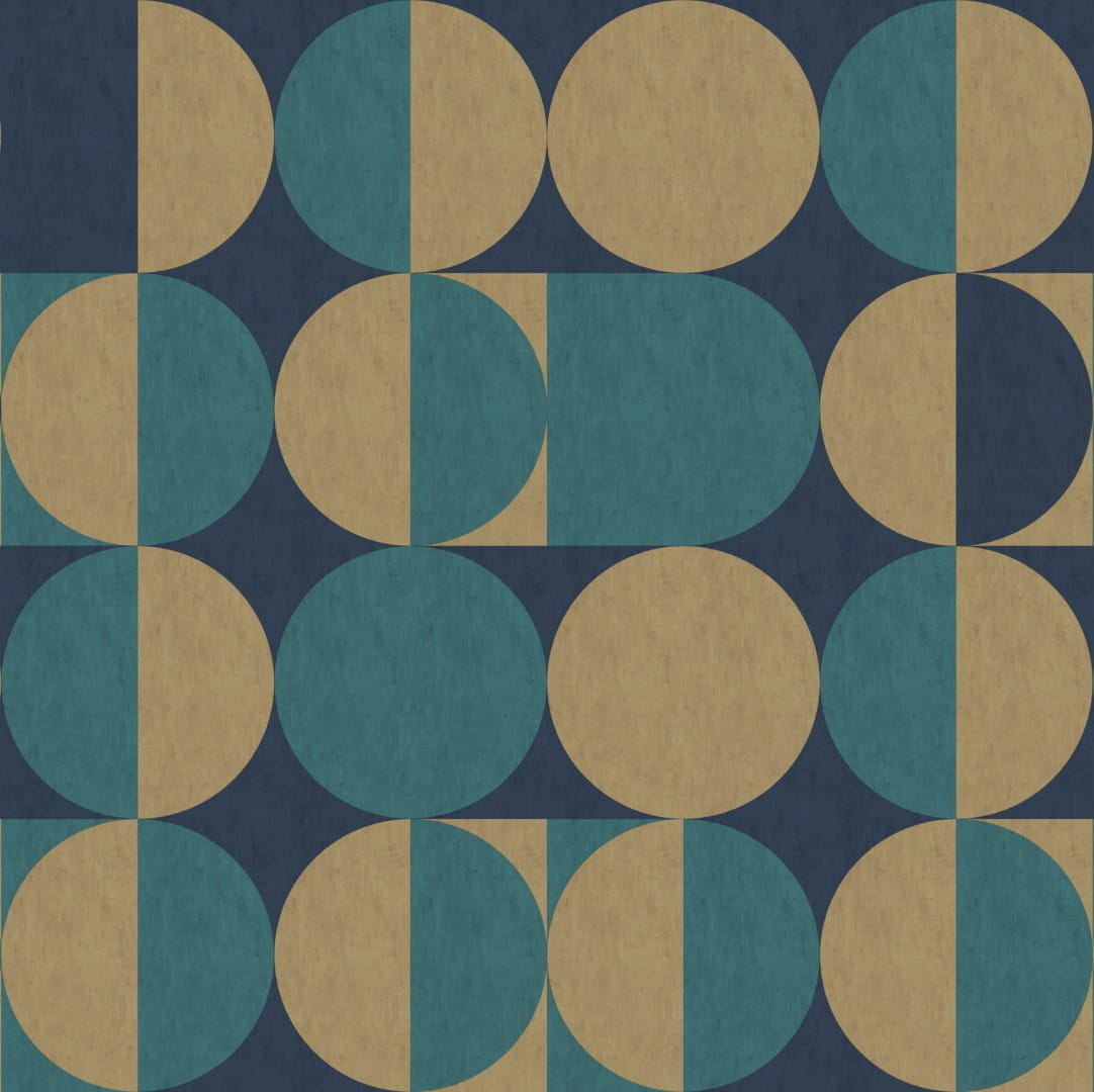 Prezentowana fototapeta ścienna z kolekcji "Magic Walls - seria Graphic" od producenta Rasch to przykład nowoczesnego designu inspirowanego stylem retro. Wzór składa się z geometrycznych kształtów – półokręgów i pełnych okręgów, tworzących symetryczną, rytmiczną kompozycję. Kolorystyka fototapety jest oparta na wyrazistych, ale jednocześnie harmonijnych barwach, które nadają kompozycji elegancki i nowoczesny charakter. Głęboki turkus i ciepły złocisty beż zostały umieszczone na ciemnym, granatowym tle, które wprowadza kontrast i dodatkowo uwydatnia geometryczny wzór.