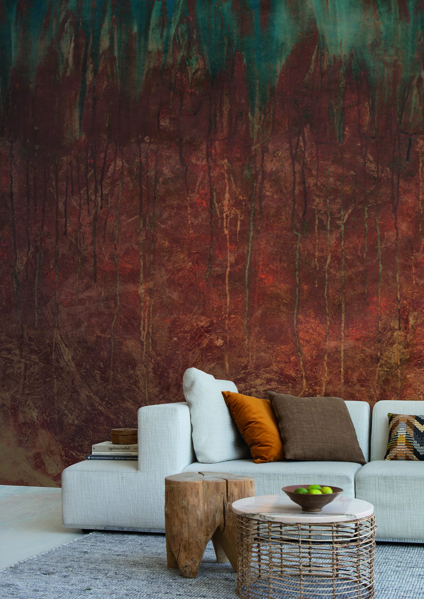 Kolorystyka opiera się na ciepłych, ziemistych tonacjach brązu i rudości, które przełamane są chłodniejszymi akcentami, tworząc harmonijny kontrast. Efektownie wyglądające smugi i przetarcia nadają fototapecie głębi i dynamiki, czyniąc ją idealnym wyborem do wnętrz w stylu loftowym, industrialnym czy eklektycznym.