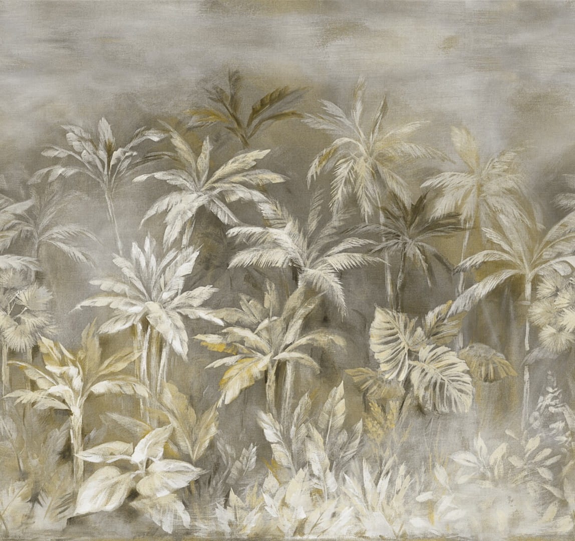 Kolorystyka muralu opiera się na jasnych, subtelnych odcieniach beżu i złamanej bieli, które wprowadzają do wnętrza poczucie ciepła i elegancji. Delikatne akcenty w pastelowych tonach złota i przygaszonego kremu dodają wzorowi wyrafinowanego charakteru. Przejścia tonalne są miękkie, tworząc harmonijny i eteryczny efekt.