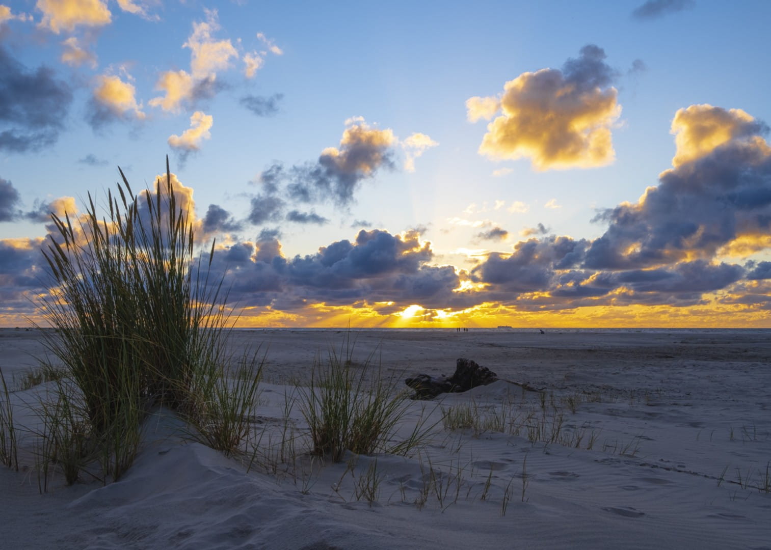 Kolorystyka fototapety to połączenie ciepłych, złotych i pomarańczowych odcieni zachodzącego słońca z chłodniejszymi tonami błękitu i szarości na niebie. Jasne, kremowe barwy piasku doskonale uzupełniają kompozycję, nadając całości lekkości i przestronności. Naturalne detale, takie jak trawy i cienie na plaży, podkreślają autentyczność pejzażu.