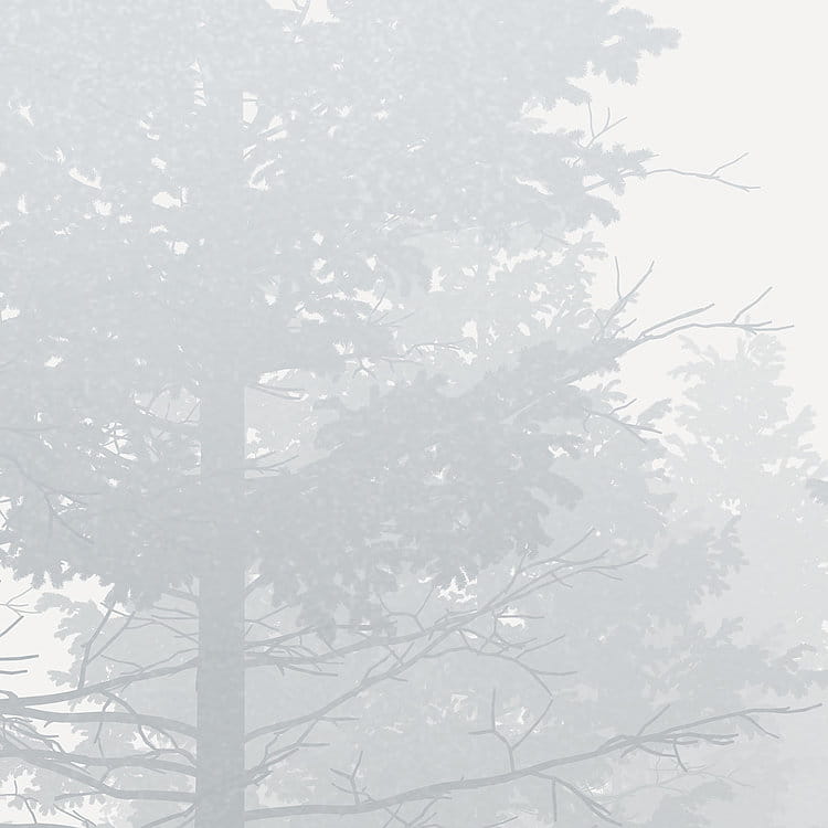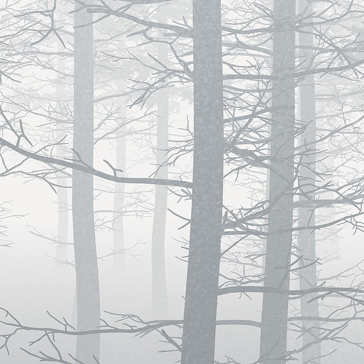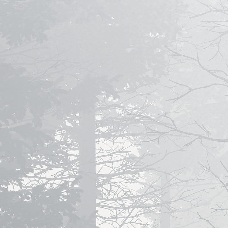 Szara zasłona mgły powoli się rozwiewa i odsłania ciemne drzewa na leśnej polanie.