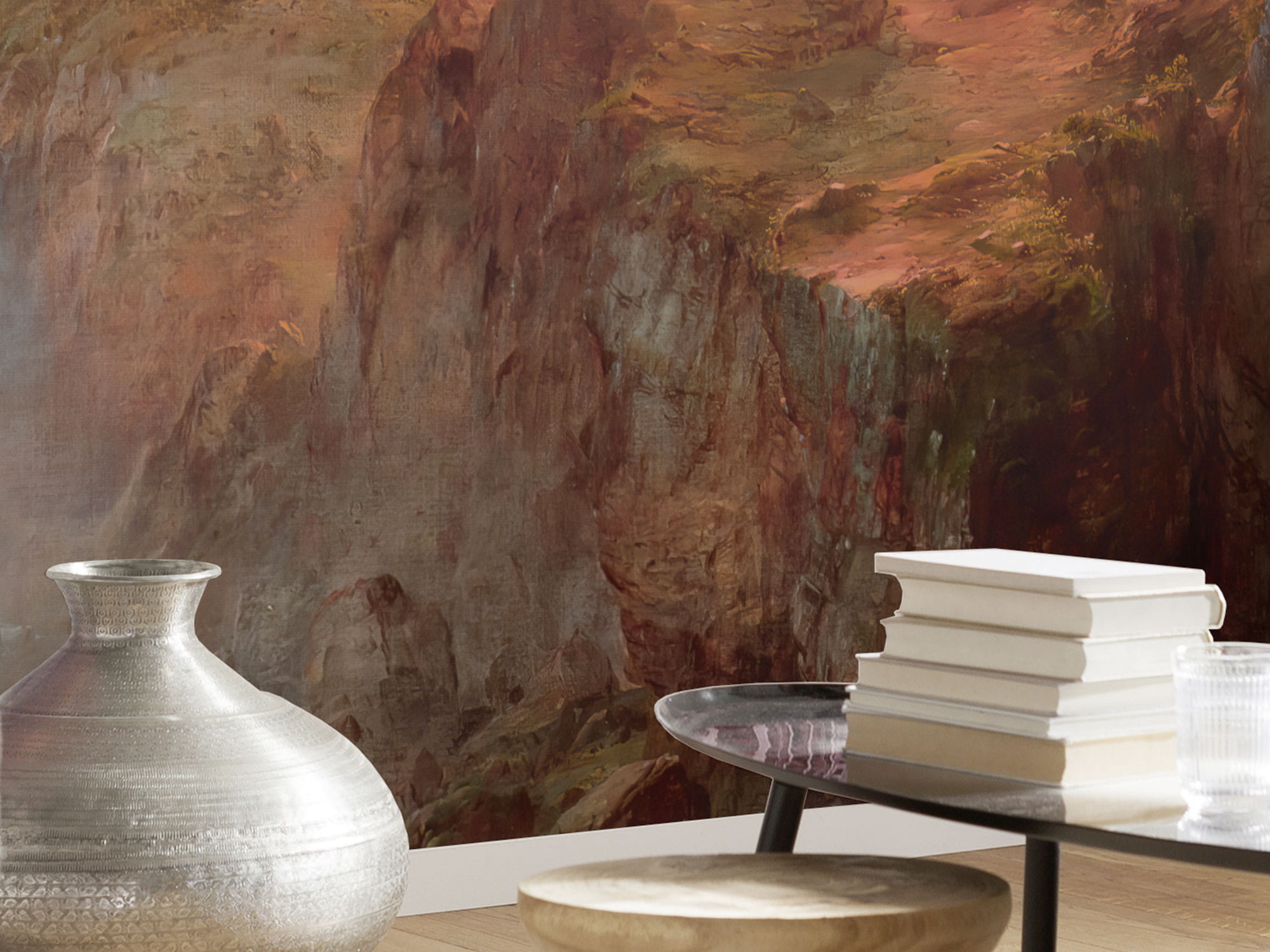 Cóż za zapierający dech w piersiach widok! Fototapeta przedstawia zachwycający spektakl natury. Zachodzące słońce oblewa ostre skały złotym światłem i doskonale podkreśla potężne wodospady
