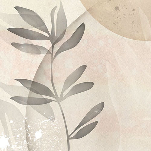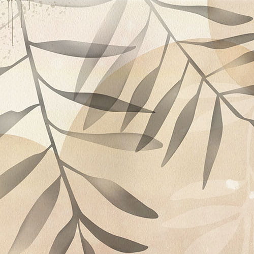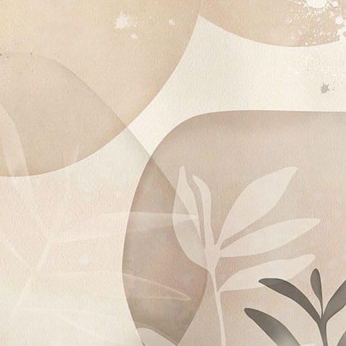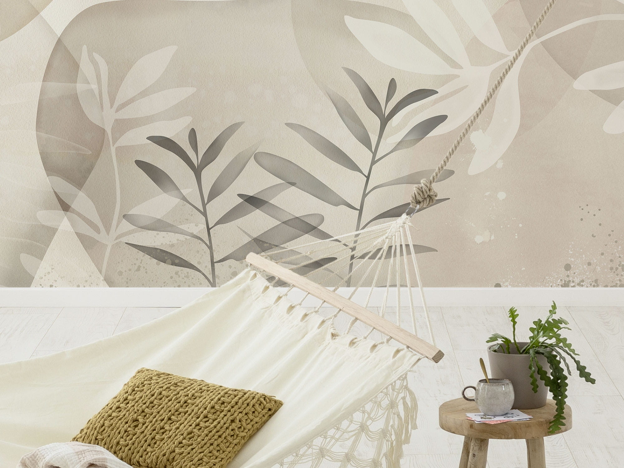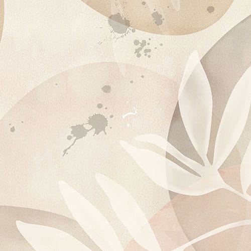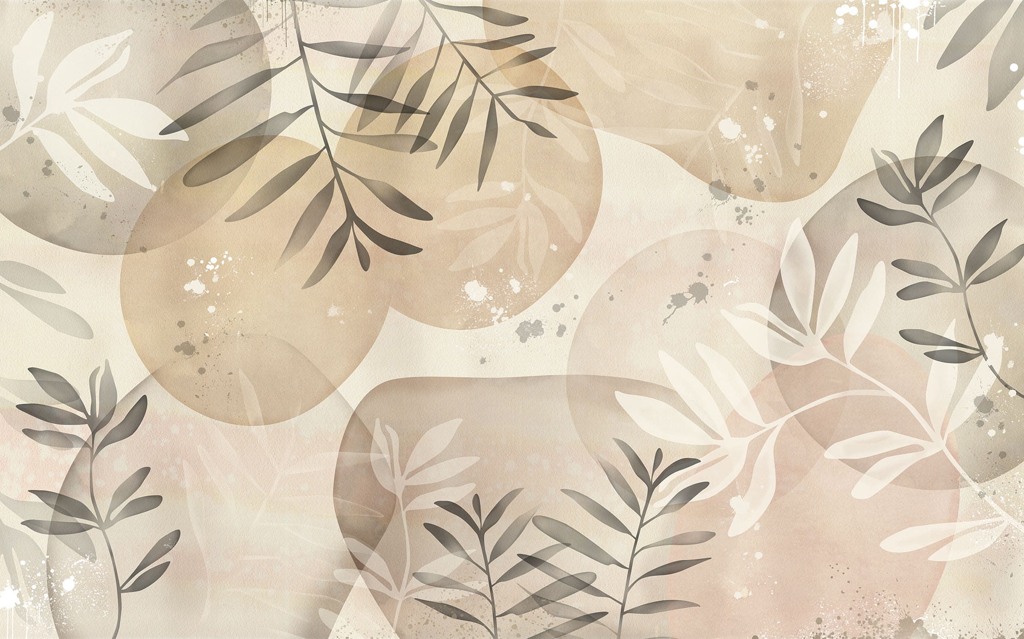 Na delikatnej beżowej tapecie splatają się zaokrąglone koła i kilka ładnych gałązek liści. Ich kolory tworzą elegancką i przyjazną atmosferę.