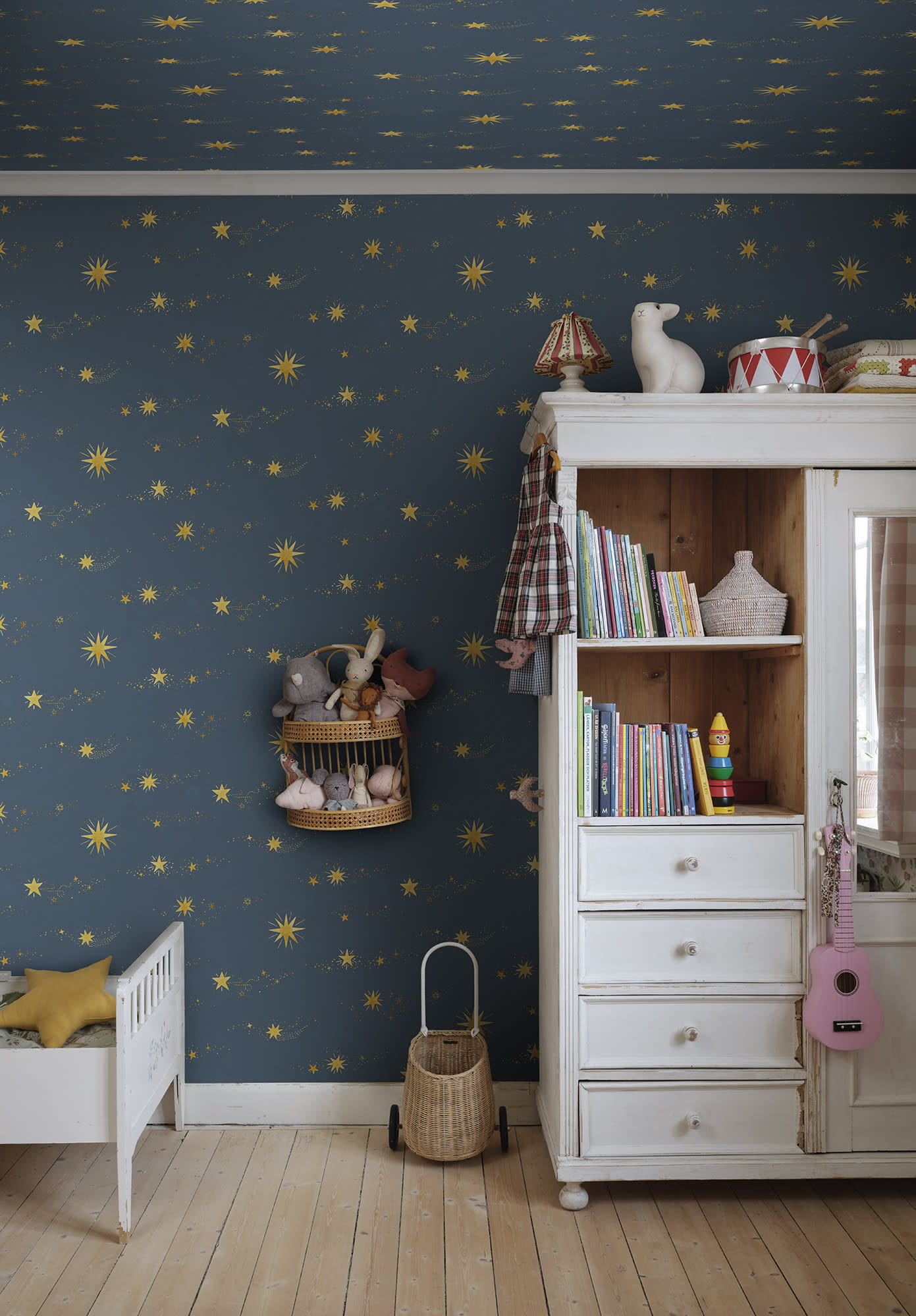 Ekskluzywny panel ścienny z kolekcji "Tidlosa", zaprojektowany przez Johannę Bradford dla szwedzkiego producenta oklein ściennych Sandberg. "Gillis" to piękne, ręcznie malowane, żółte gwiazdy, roztańczone na ciemnoniebieskim tle, niczym gwiazdy na nocnym niebie. Projekt występuje w pięciu wersjach kolorystycznych. Pierwotnie miał służyć jako "marzycielska" tapeta sufitowa, jednak bez wątpienia równie pięknie będzie prezentować się też na ścianie. W wyjątkowy sposób udekoruje sypialnię, pokój młodzieżowy, czy też dziecięcy tworząc we wnętrzu przytulną i odprężającą atmosferę. Tapeta flizelinowa, odporna na zmywanie w stopniu dobrym, dzięki czemu można ją bardzo delikatnie przecierać ściereczką.