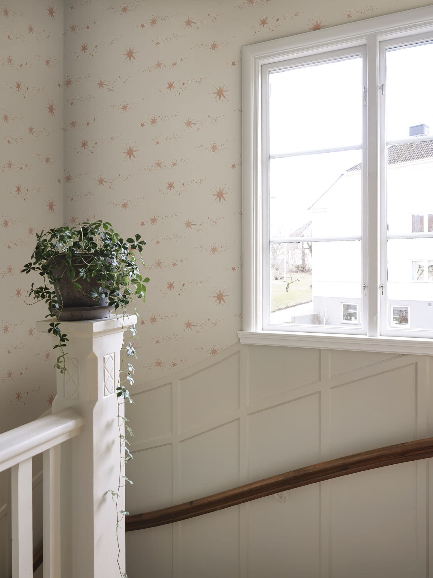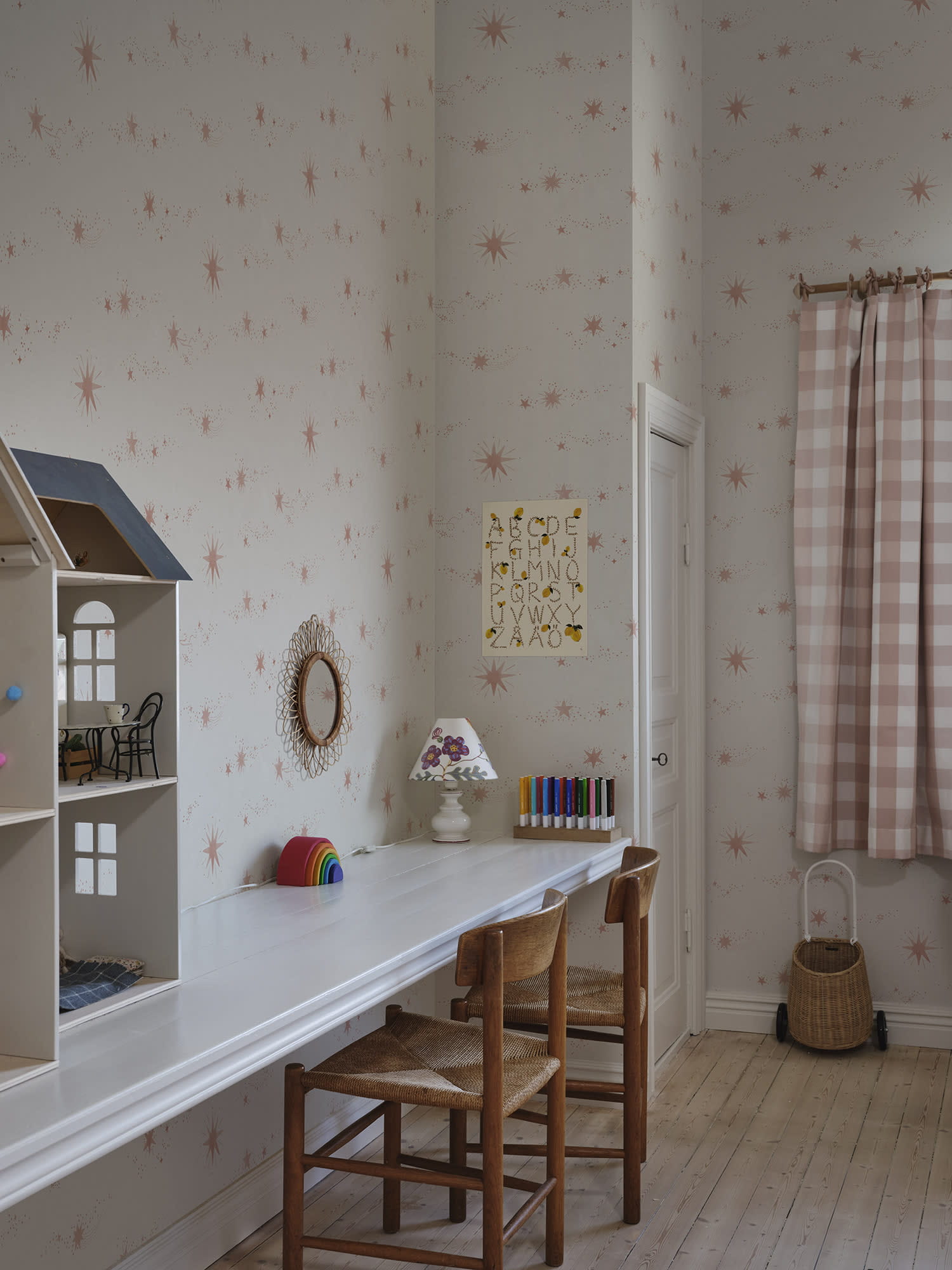 Ekskluzywny panel ścienny z kolekcji "Tidlosa", zaprojektowany przez Johannę Bradford dla szwedzkiego producenta oklein ściennych Sandberg. "Gillis" to piękne, ręcznie malowane gwiazdy, roztańczone na papierze niczym gwiazdy na nocnym niebie. Delikatna kolorystyka, będąca zestawieniem jasnego różu z bielą sprawia, że całość prezentuje się nienachalnie i lekko. Projekt występuje w pięciu wersjach kolorystycznych. Pierwotnie miał służyć jako "marzycielska" tapeta sufitowa, jednak bez wątpienia równie pięknie będzie prezentować się też na ścianie. W wyjątkowy sposób udekoruje sypialnię, pokój młodzieżowy, czy też dziecięcy tworząc we wnętrzu przytulną i odprężającą atmosferę. Tapeta flizelinowa, odporna na zmywanie w stopniu dobrym, dzięki czemu można ją bardzo delikatnie przecierać ściereczką.