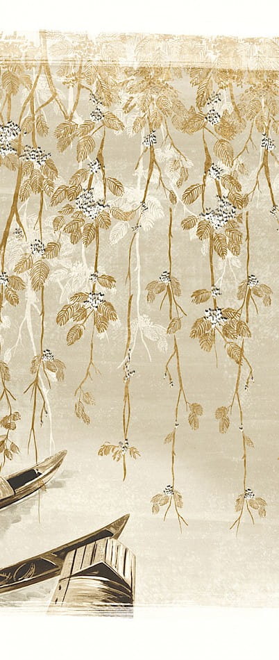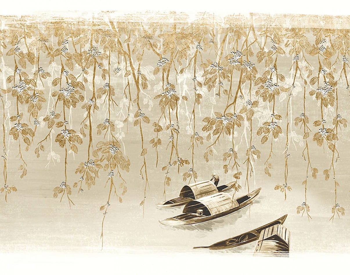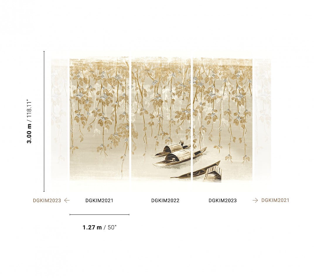 Mural Khroma Kimono River Dew DGKIM2023 przedstawia krajobraz japońskiej rzeki. Zwisające gałęzie drzew oraz dryfujące na spokojnej wodzie drewniane łodzie, scalają się w jeden panoramiczny krajobraz, przenosząc widza do malowniczego kraju kwitnącej wiśni. Mural, składa się z trzech odrębnych paneli, które w całości tworzą szeroki wachlarz możliwości aranżacyjnych. Fototapeta na flizelinie dostępna w trzech wariantach kolorystycznych, daje możliwość dopasowania do konkretnych preferencji oraz charakteru pomieszczenia.