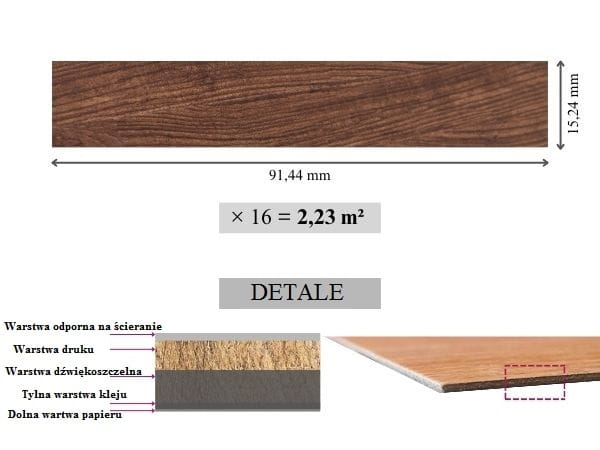 Samoprzylepna deska podłogowa PCV Rozmiar 15,24 cm x 91,44 cm grubość 1,5 mm
