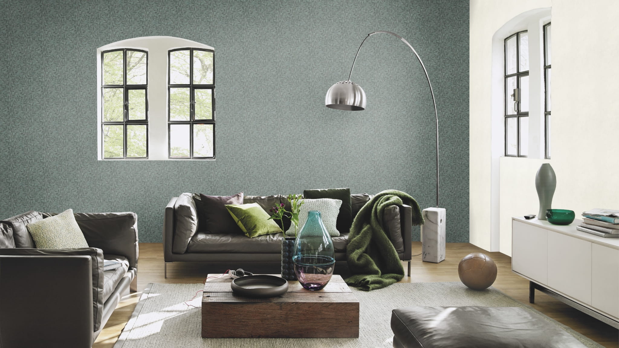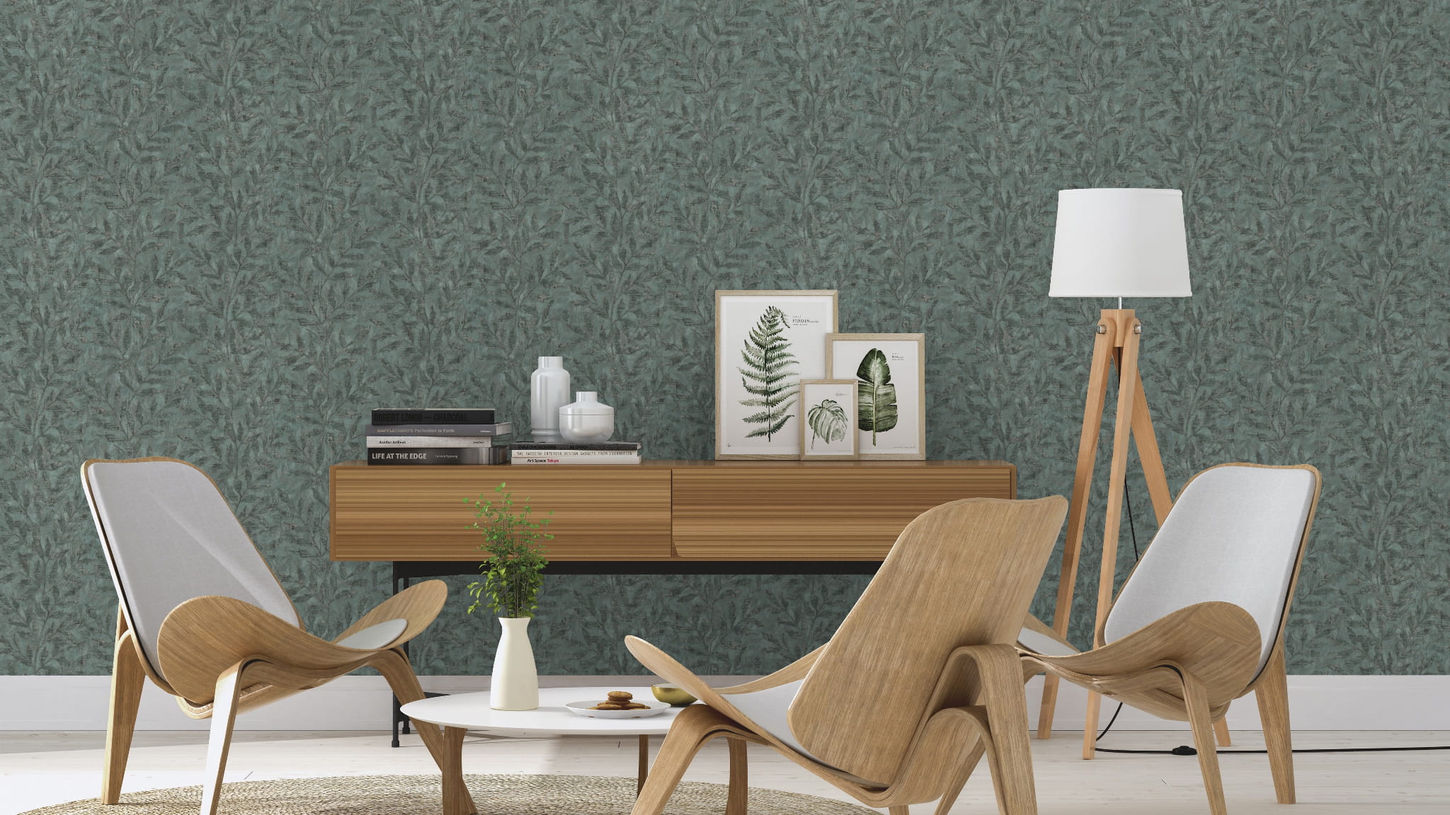 Tapeta z abstrakcyjnym połączeniem elementów natury z przemysłem, charakteryzuje się nowoczesnym i oryginalnym designem. Motyw liści gęsto umieszczonych na tle metalowej blachy to doskonała kompozycja, łącząca w sobie naturalność z fabrycznym klimatem. Dzięki swojej teksturowanej strukturze oraz metalicznemu wykończeniu nada pomieszczeniu loftowej elegancji. Zaprezentowane na tapecie ciemnozielone liście na tle blachy w kolorze morskiej zieleni, zostały wzbogacone subtelnie rozmieszczonymi opiłkami srebra, czyniąc ją jeszcze bardziej wyjątkową.