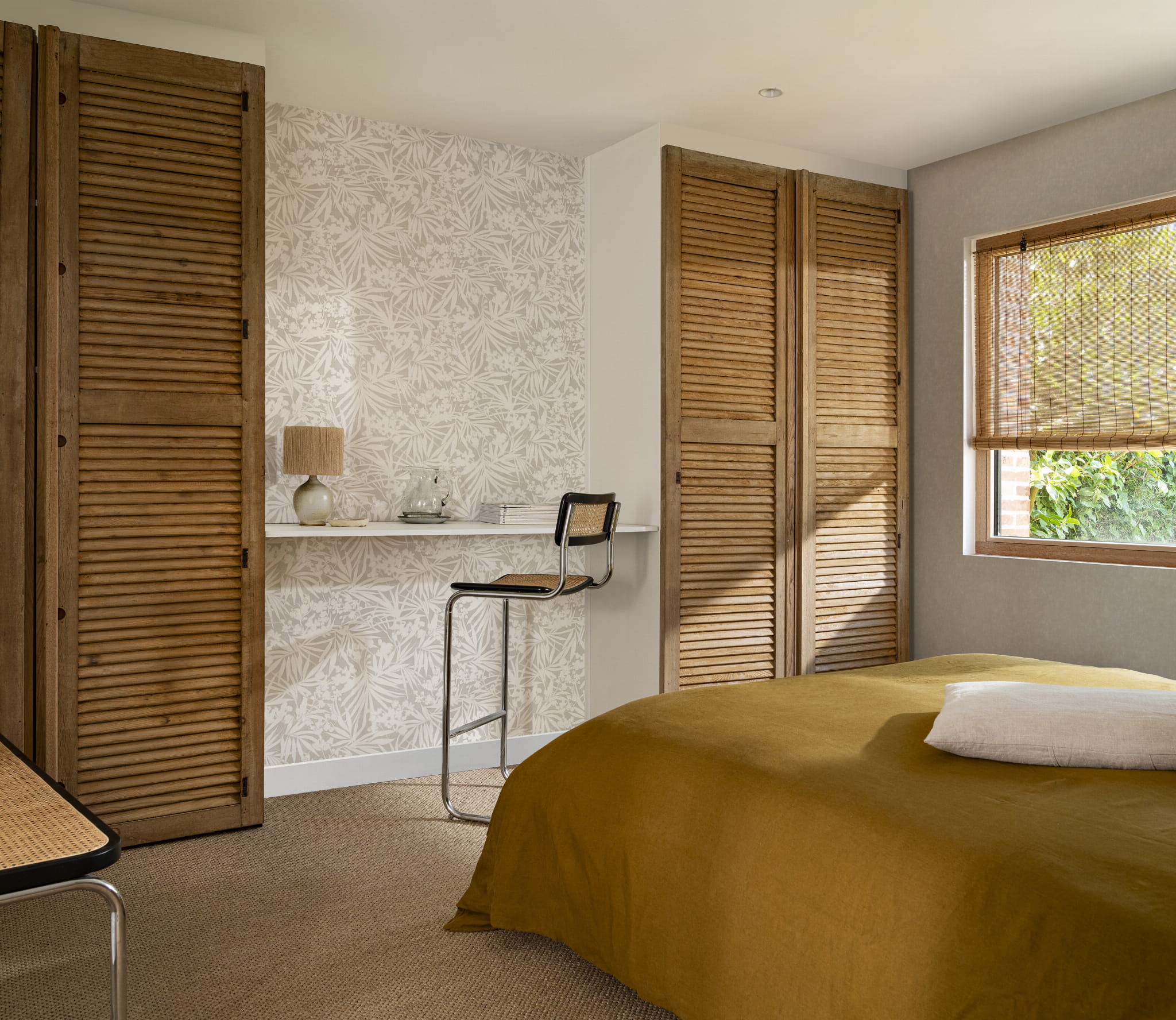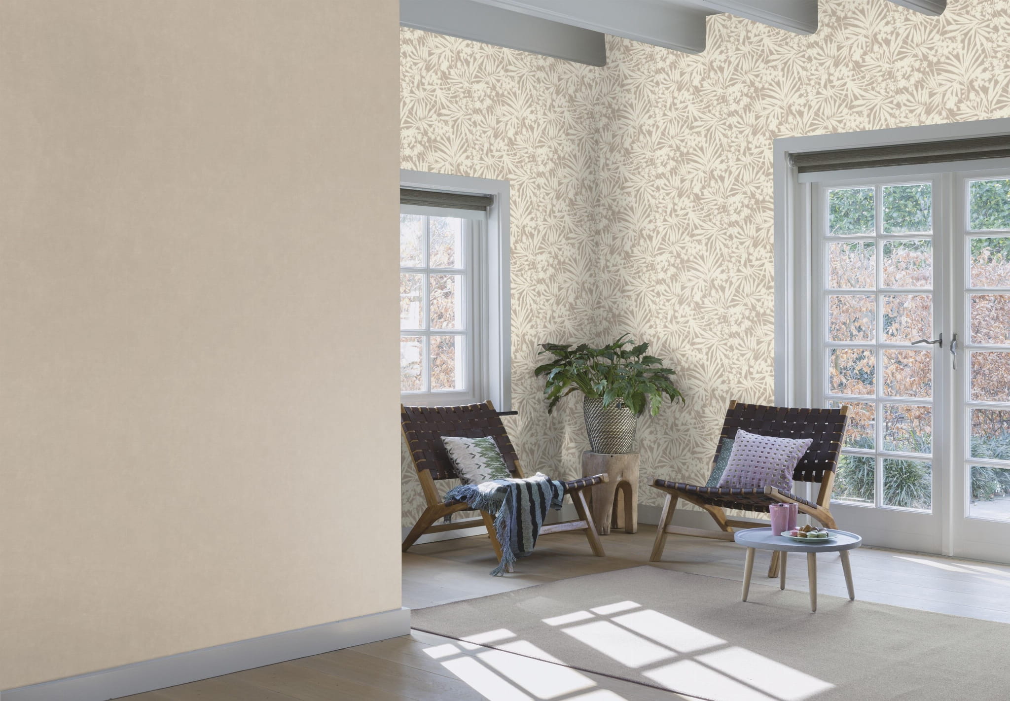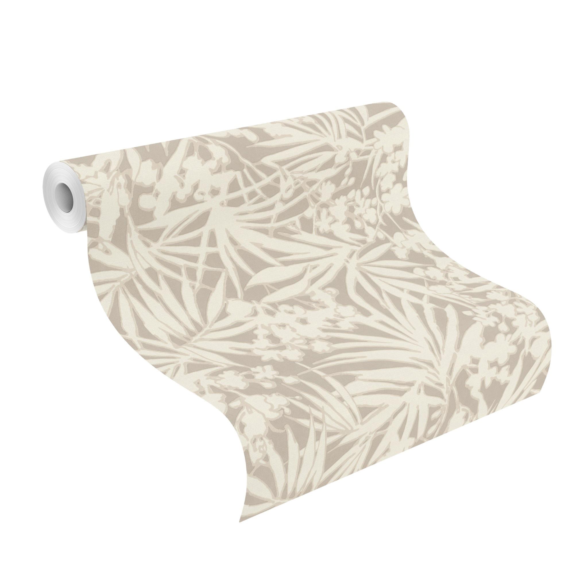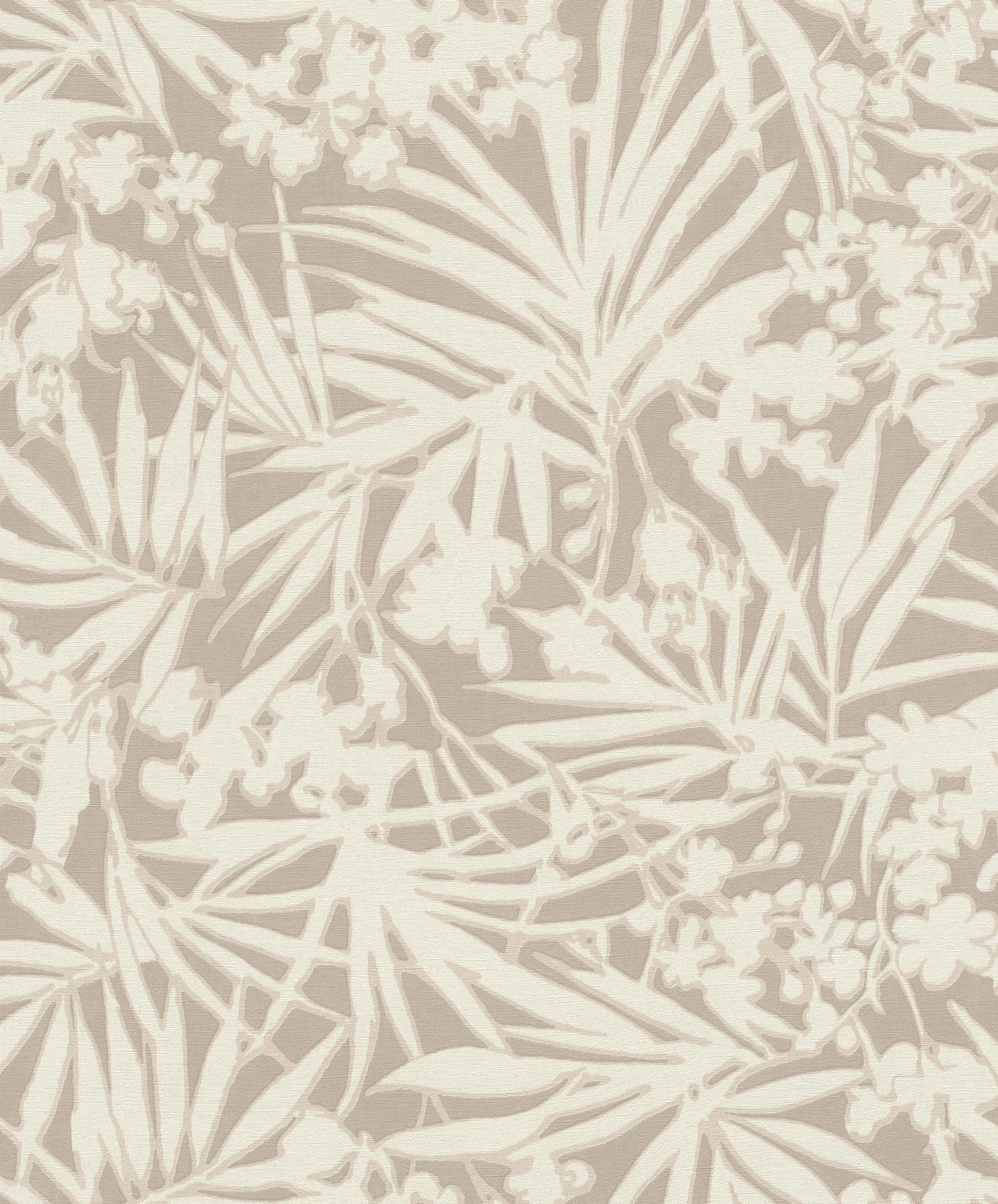 Tapeta ścienna z roślinnym motywem, przedstawiającym gęsto rozmieszczone, duże i okazałe egzotyczne liście palm i kwiatów. Struktura tapety jest jednolita, imitująca delikatną tekstylną powierzchnię. Jednobarwne białe liście otoczone są jasnobeżowym konturem. Całość doskonale prezentuje się na ciemno-beżowym tle. Połączenia kolorów są dość estetyczne i efektywne, przypominają delikatne muśnięcia pędzla i akwareli. Wpasuje się w wystrój każdego pomieszczenia, zaaranżowanego, zarówno w stylu klasycznym, jak i nowoczesnym. Matowe wykończenie stanowi dodatkową dekorację, dodając całej kompozycji uroku i elegancji. Sprawdzi się, jako samodzielna dekoracja ścian lub zestawiona z szeroką gamą wzorów z kolekcji Paraiso, stworzy wyjątkowy wystrój do sypialni, jadalni, salonu, pokoju młodzieżowego, nadając im niepowtarzalny i pełen energii charakter. Struktura tapety, jest twarda i lekko chropowata na całej powierzchni, z nieznacznie wyczuwalną pod palcami fakturą. Tapeta winylowa na flizelinie, charakteryzuje się bardzo dobrą odpornością na zmywanie, wierzch można przemywać wilgotną ściereczką.