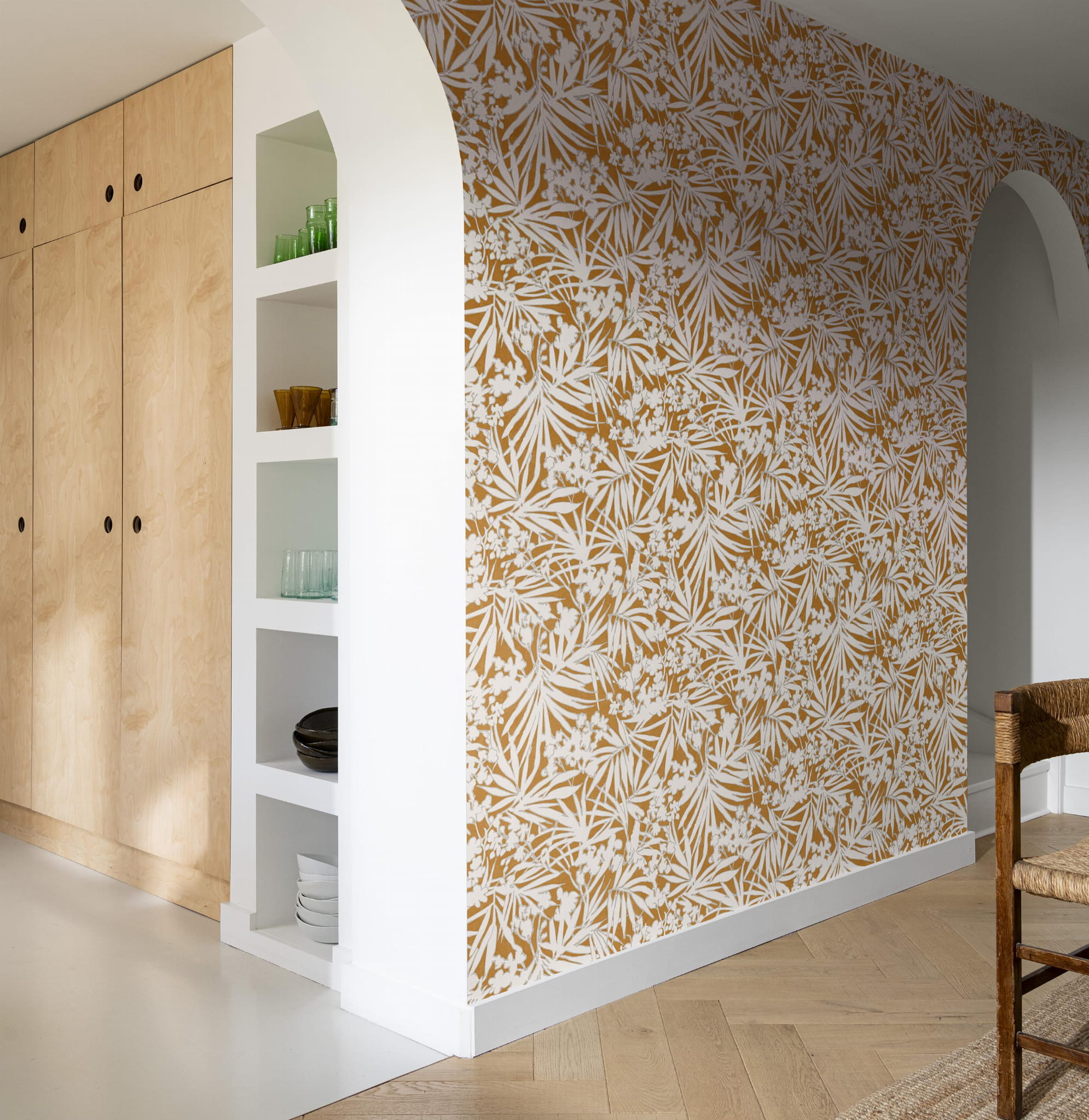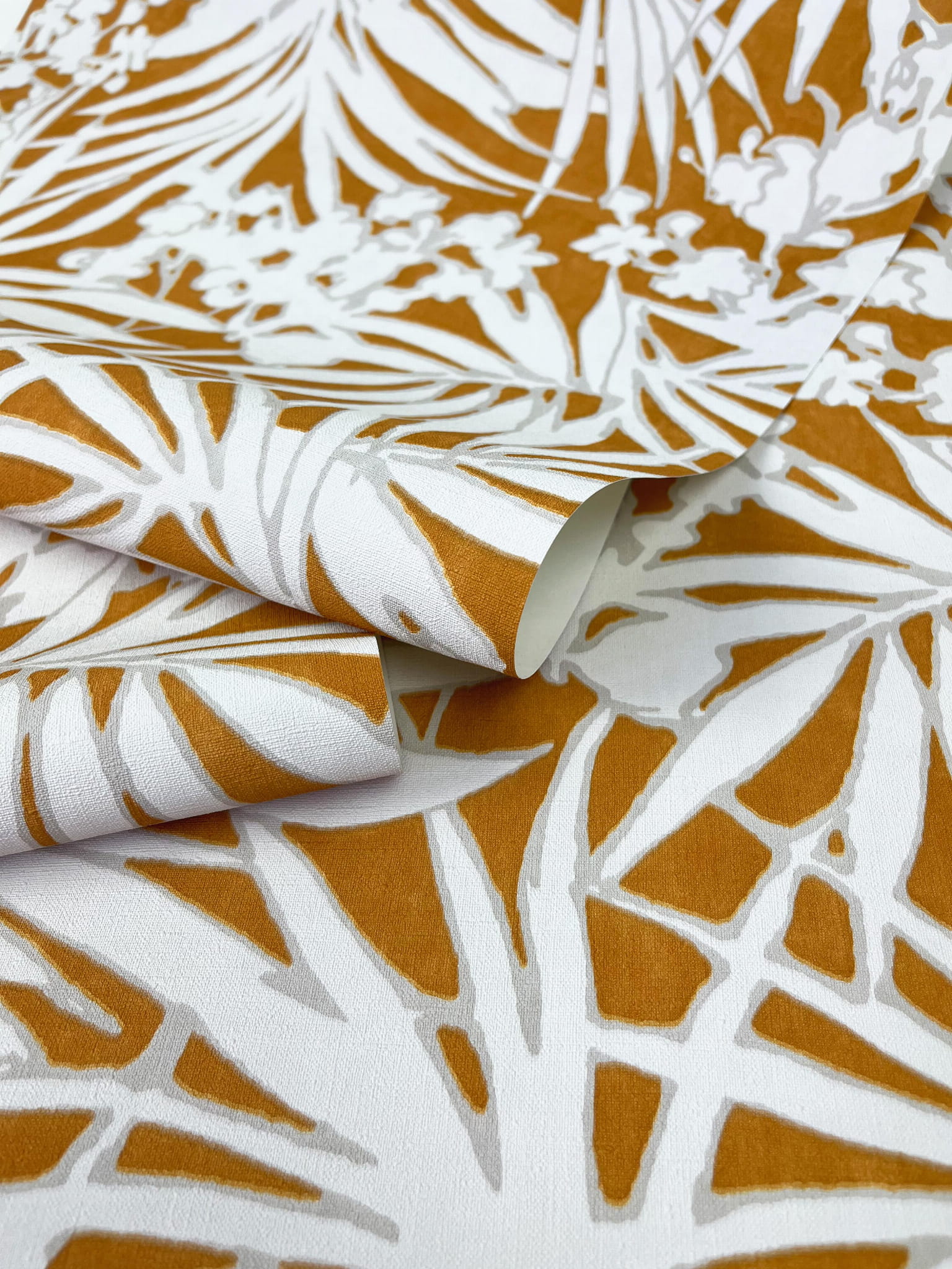 Tapeta ścienna z roślinnym motywem, przedstawiającym gęsto rozmieszczone, duże i okazałe egzotyczne liście palm i kwiatów. Struktura tapety jest jednolita, imitująca delikatną tekstylną powierzchnię. Jednobarwne białe liście otoczone są jasnopopielatym konturem. Całość doskonale prezentuje się na ochrowo-brązowym tle. Połączenia kolorów są dość estetyczne i efektywne, przypominają delikatne muśnięcia pędzla i akwareli. Wpasuje się w wystrój każdego pomieszczenia, zaaranżowanego, zarówno w stylu klasycznym, jak i nowoczesnym. Matowe wykończenie stanowi dodatkową dekorację, dodając całej kompozycji uroku i elegancji. Sprawdzi się, jako samodzielna dekoracja ścian lub zestawiona z szeroką gamą wzorów z kolekcji Paraiso, stworzy wyjątkowy wystrój do sypialni, jadalni, salonu, pokoju młodzieżowego, nadając im niepowtarzalny i pełen energii charakter. Struktura tapety, jest twarda i lekko chropowata na całej powierzchni, z nieznacznie wyczuwalną pod palcami fakturą. Tapeta winylowa na flizelinie, charakteryzuje się bardzo dobrą odpornością na zmywanie, wierzch można przemywać wilgotną ściereczką.