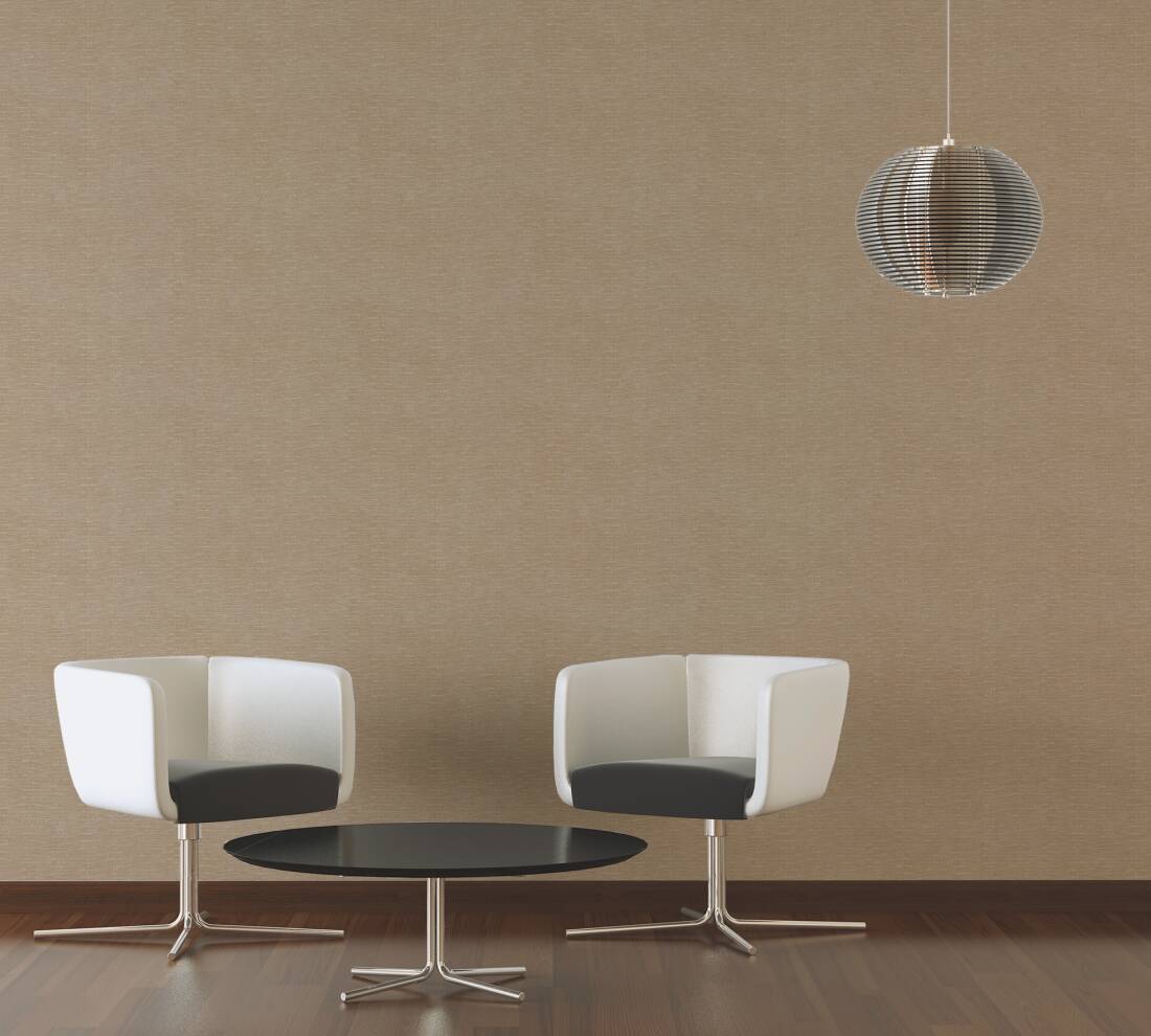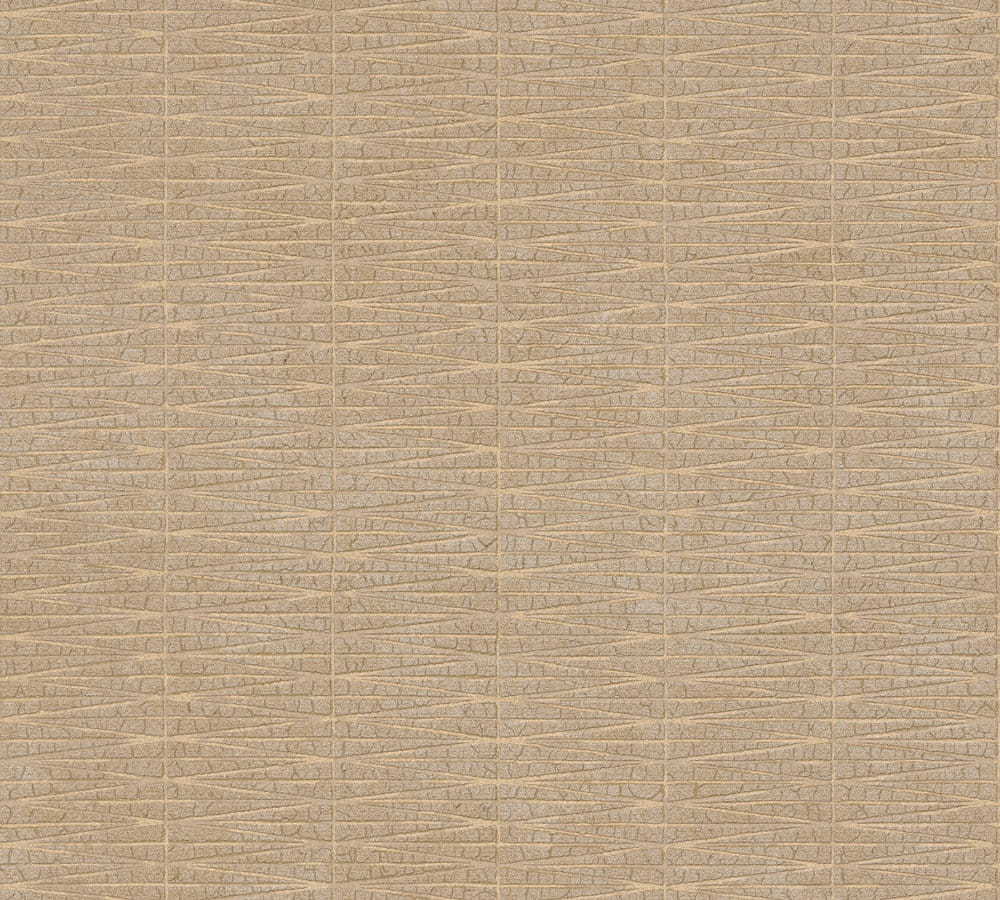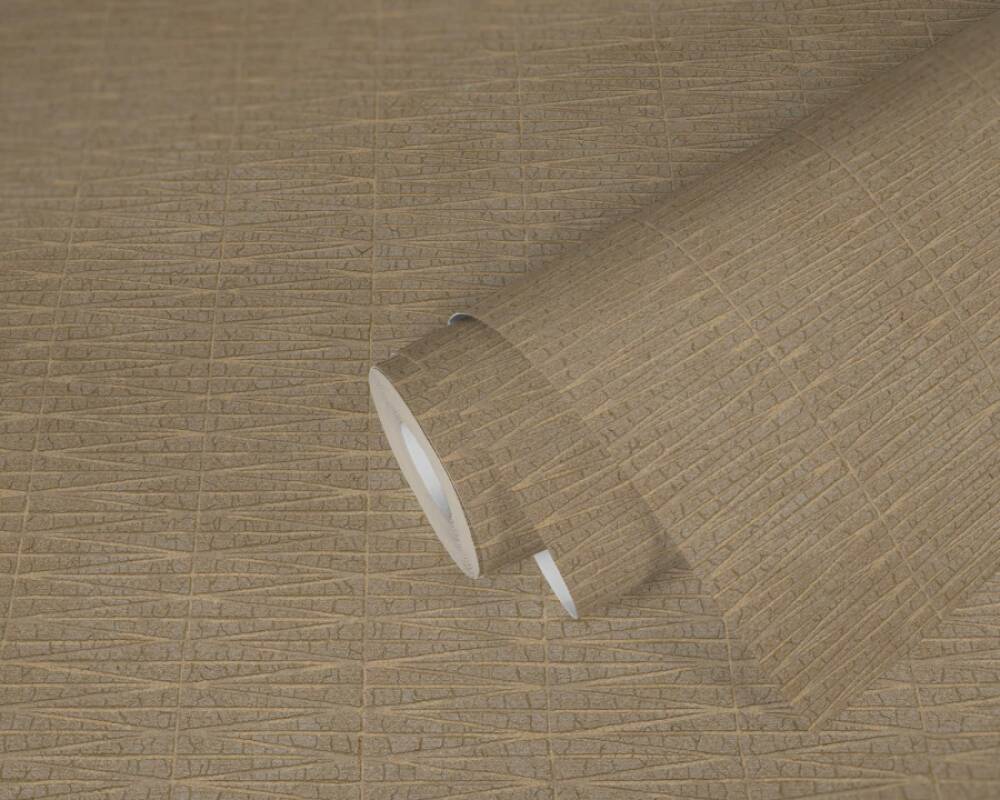 Powierzchnia tapety jest matowa z metalizowanymi, wklęsłymi złoto-szampańskimi kreskami, a kolorystyka jest zachowana w odcieniach brązowego.