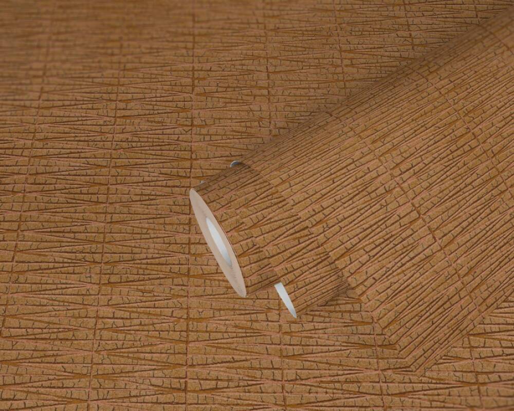 Powierzchnia tapety jest matowa z metalizowanymi, wklęsłymi miedzianymi kreskami, a kolorystyka jest zachowana w odcieniach pomarańczowego.