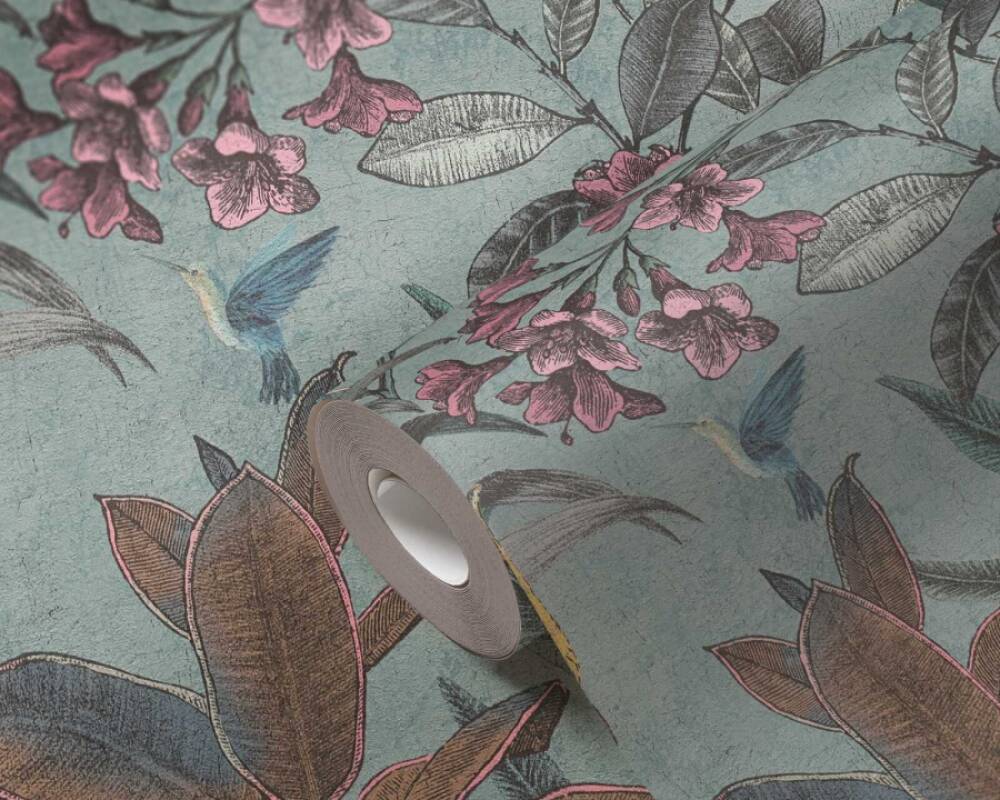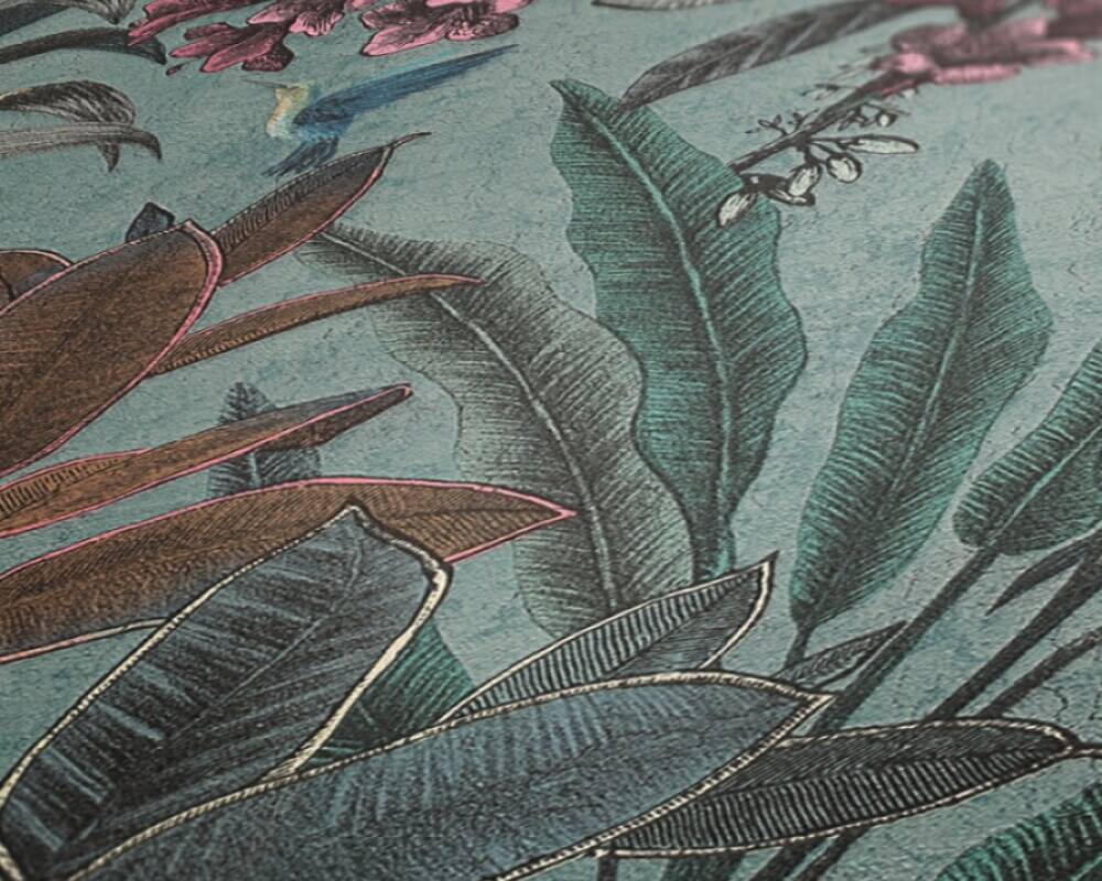 Powyższa tapeta winylowa na flizelinie, niemieckiego producenta A.S – Creation z kolekcji „Pint Walls 2”, wyróżnia się pięknym motywem botanicznym, który wniesie do Twojego wnętrza tropikalny klimat. Wzór to kompozycja dużych liści i kwiatów, wśród których znajdują się Papugi i Kolibry. Projekt charakteryzuje spokojna i neutralna kolorystyka, dzięki której całość jest nieprzytłaczająca i przytulna w odbiorze. Dominuje ciemna zieleń, ciepły brąz i szarość, dopełnione jasnym różem, turkusem i kolorem żółtym oraz bielą i czernią. Tło ma jasny, niebieskawo-szary odcień a na jego powierzchni możne dostrzec czarne „spękania”. Struktura tapety przypomina tynk ścienny, jej powierzchnia jest delikatnie tłoczona, chropowata w dotyku a wykończenie matowe. Tapeta doskonale nadaje się do salonu, jadalni, sypialni, przedpokoju, czy też młodzieżowego wnętrza a nawet i kuchni. Świetnie pasuje do wnętrz nowoczesnych, inspirowanych naturą i tropikalnym stylem. Zastosowanie tapety jako dekoracji jednej ściany i zestawienie jej z pasującymi do niej tapetami jednokolorowymi, które prezentujemy poniżej pozwoli uzyskać modną aranżację, która będzie spójna i harmonijna. Powierzchnia tapety jest odporna na szorowanie, dzięki czemu utrzymanie jej w czystości nie będzie stanowiło problemu.