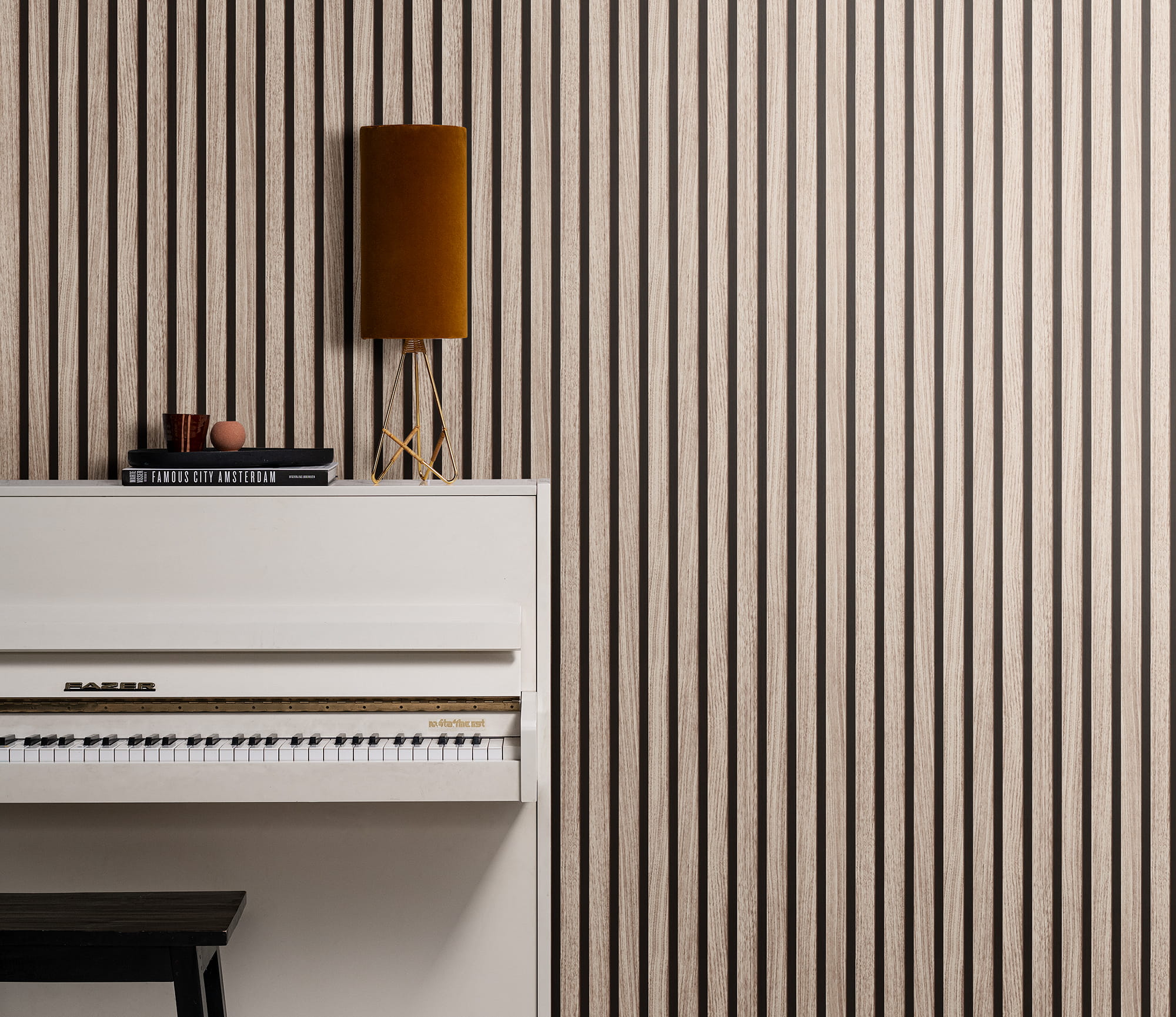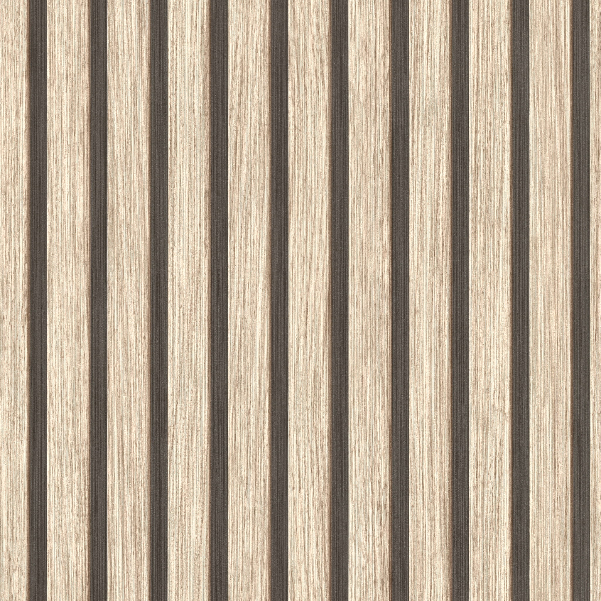 Drewniany motyw na ścianach to doskonała propozycja dla tych, którzy cenią sobie innowacyjność i minimalizm. Tapeta w lamele to połączenie harmonijnej klasyki z inspirującą nowoczesnością. Ciemniejsze tło tapety w kolorze czarnym, wypełniają wąskie drewniane listewki w o wiele jaśniejszej – beżowej –tonacji. Dzięki nowatorskiej technice cieniowana i gry świateł, powstaje złudna, optyczna iluzja tworząc trójwymiarowy efekt. Realistyczne tłoczenia i naturalna kolorystyka, przedstawiają autentyczny wygląd lameli, których nie będzie łatwo odróżnić od prawdziwych listewek.