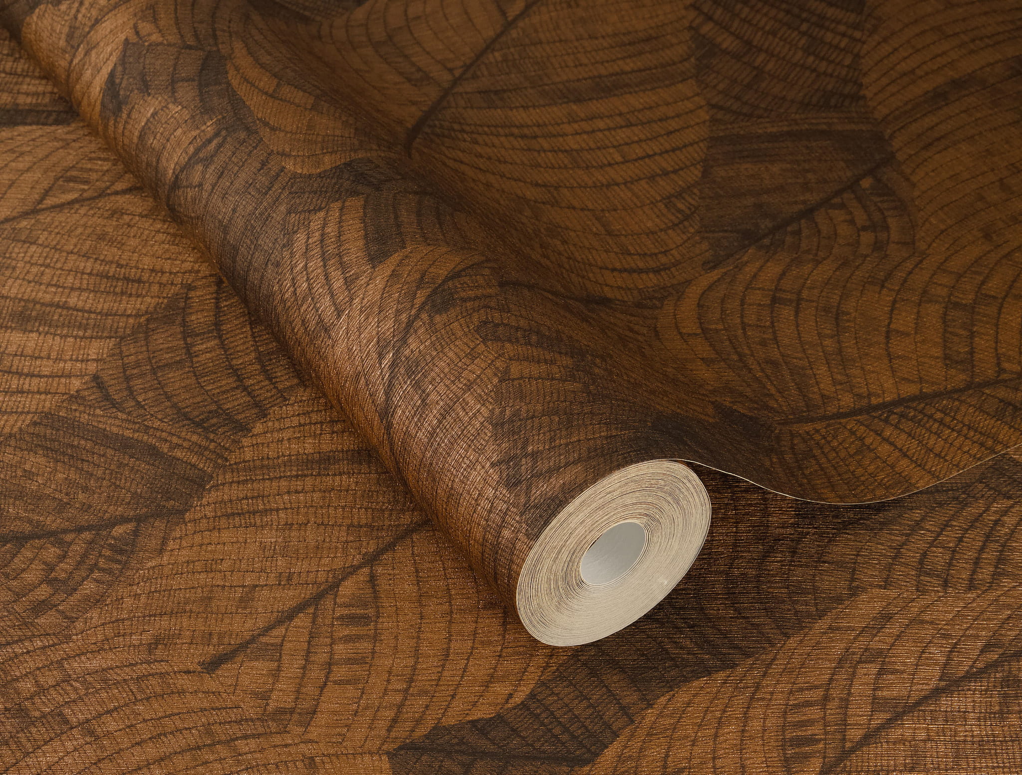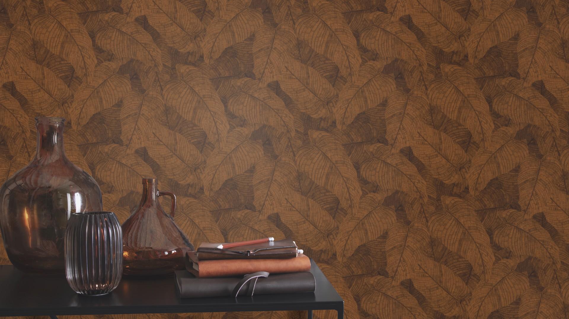 Powyższa tapeta o unikalnym, egzotycznym wzorze to idealny przepis na stworzenie klimatycznej aranżacji wnętrza. Stylizowany motyw dużych liści bananowca, utrzymany w ciepłych, brązowo-miedzianych odcieniach prezentuje się bardzo przytulnie i elegancko, tworzy atmosferę spokoju i harmonii. Wyraziste detale faktury dodają tapecie głębi a subtelny, metaliczny połysk jaśniejszych elementów wzoru tworzy piękne refleksy na ścianie. Tekstylna, prążkowana struktura tapety podkreśla naturalny styl kompozycji. Tapeta doskonale sprawdzi się w salonie, sypialni, biurze, czy przestrzeniach komercyjnych. Wpasuje się zarówno do nowoczesnych, jak i bardziej klasycznych aranżacji. Może stanowić główny element dekoracyjny wnętrza, lub być tłem dla innych elementów wyposażenia. Zestawienie jej meblami i dodatkami w neutralnych kolorach, pomoże stworzyć spójną harmonijną przestrzeń. Prezentowana tapeta jest tapetą flizelinową, zmywalną w bardzo dobrym stopniu, dzięki czemu łatwą do utrzymania w czystości. Produkt pochodzi z ekskluzywnej kolekcji „Amara”, niemieckiego producenta Rasch.