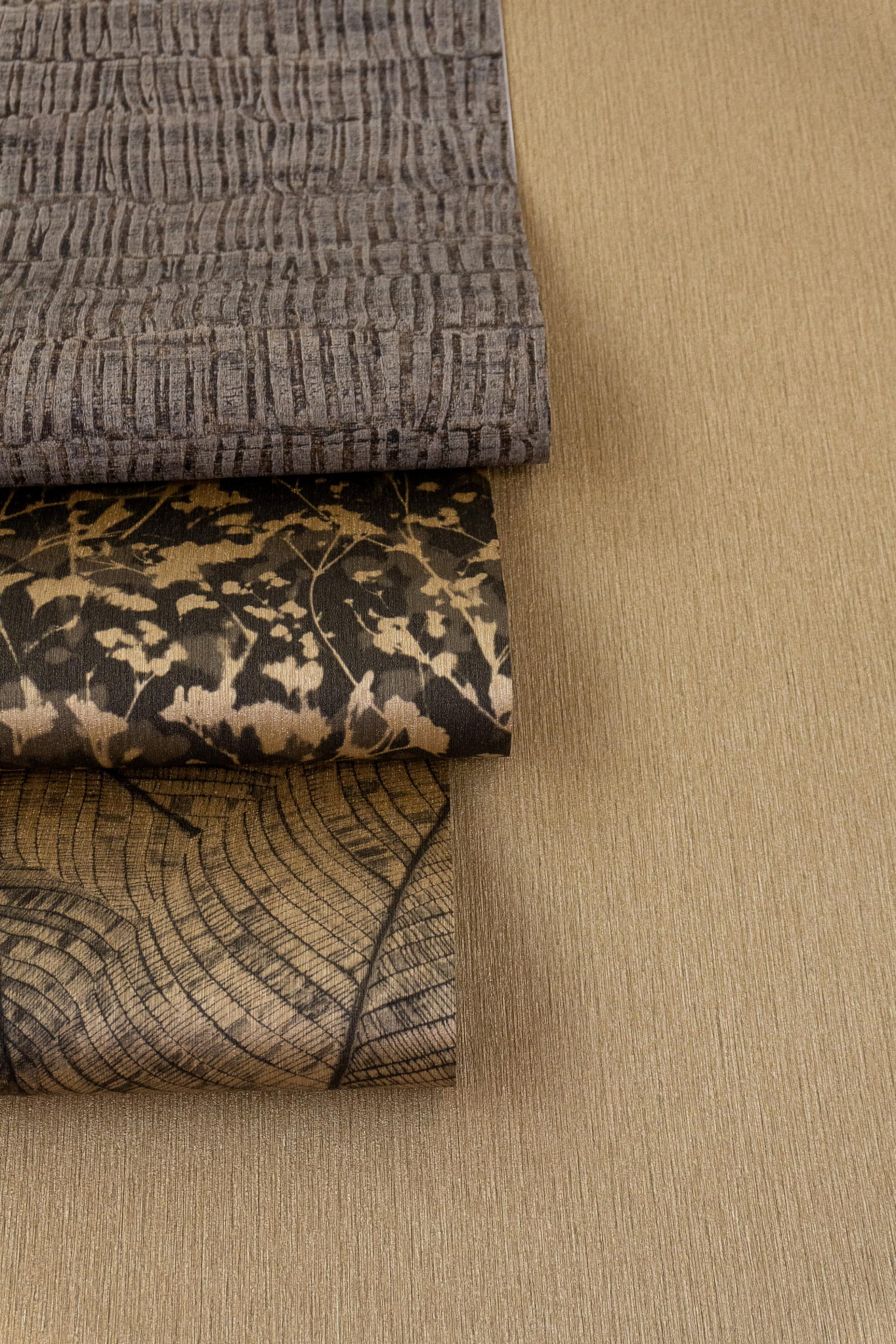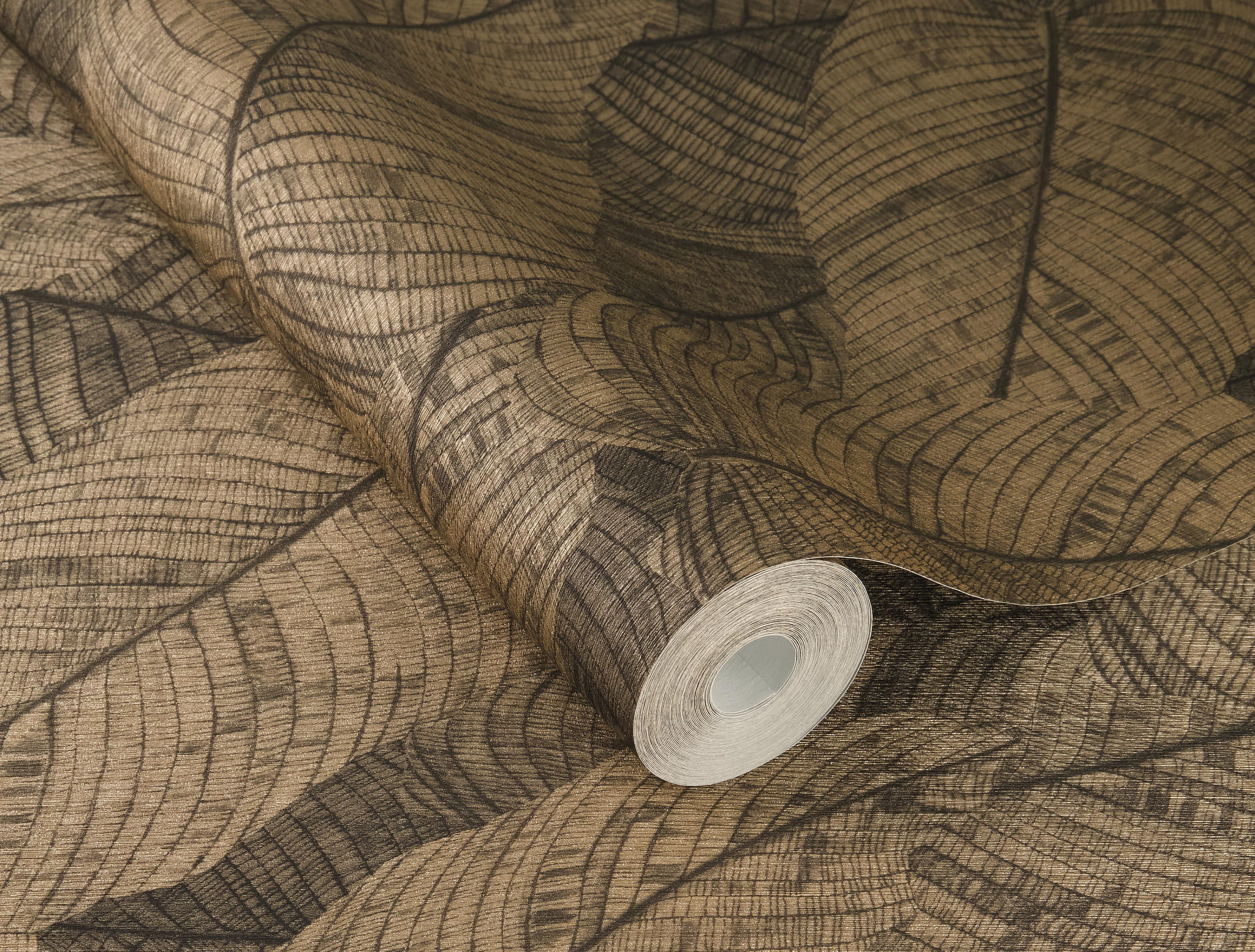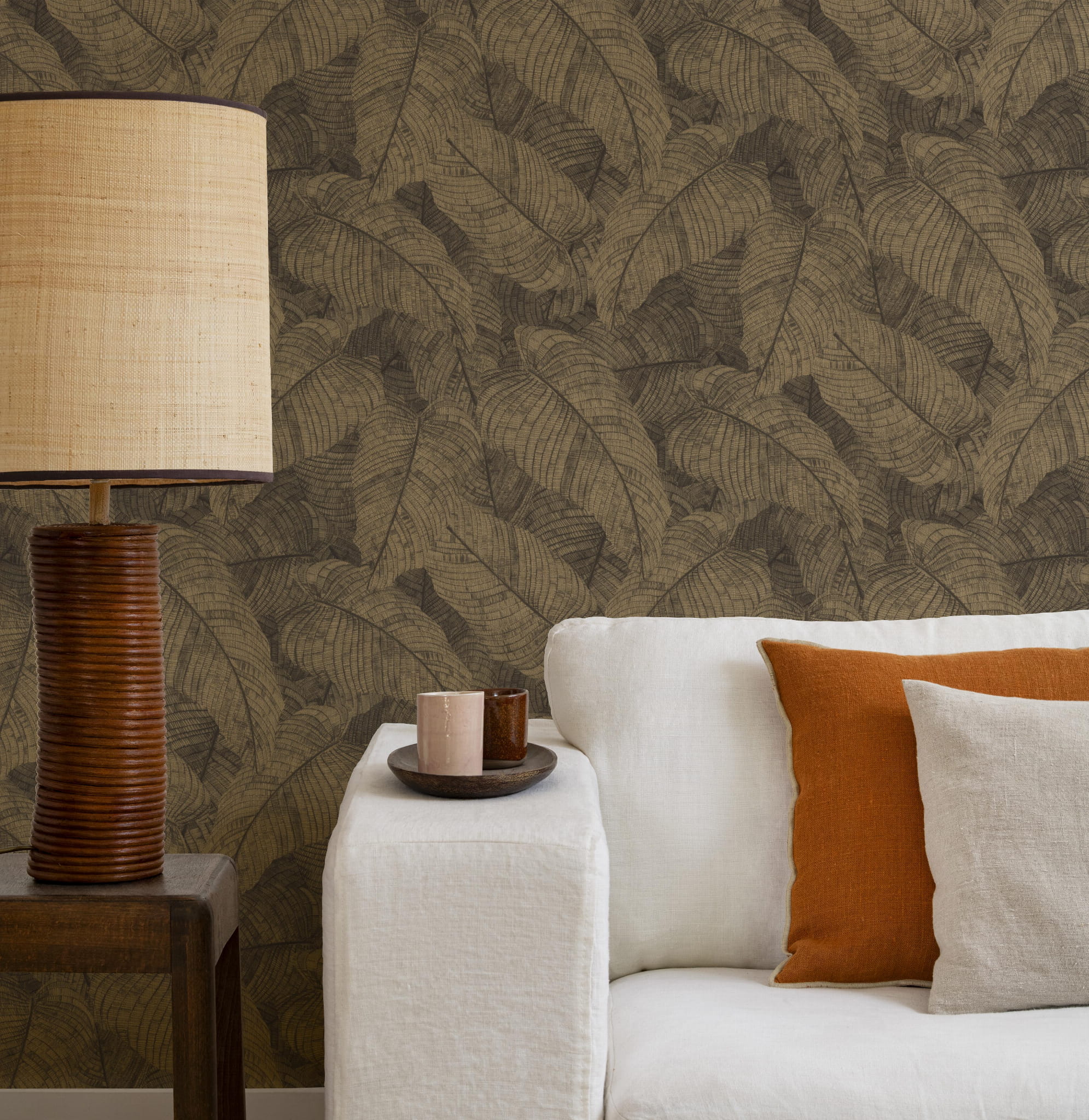 Powyższa tapeta o unikalnym, egzotycznym wzorze to idealny przepis na stworzenie klimatycznej aranżacji wnętrza. Stylizowany motyw dużych liści bananowca, utrzymany w odcieniu złota i ciemnego, szarego brązu prezentuje się bardzo przytulnie i elegancko, tworzy atmosferę spokoju i harmonii. Wyraziste detale faktury dodają tapecie głębi a subtelny, metaliczny połysk złotych elementów wzoru tworzy piękne refleksy na ścianie. Tekstylna, prążkowana struktura tapety podkreśla naturalny styl kompozycji. Tapeta doskonale sprawdzi się w salonie, sypialni, biurze, czy przestrzeniach komercyjnych. Wpasuje się zarówno do nowoczesnych, jak i bardziej klasycznych aranżacji. Może stanowić główny element dekoracyjny wnętrza, lub być tłem dla innych elementów wyposażenia. Zestawienie jej meblami i dodatkami w neutralnych kolorach, pomoże stworzyć spójną harmonijną przestrzeń. Świetnie sprawdzi się w postaci dekoracji jednej ściany, tworząc stylowe zestawienie z tapetami, które prezentujemy poniżej. Prezentowana tapeta jest tapetą flizelinową, zmywalną w bardzo dobrym stopniu, dzięki czemu łatwą do utrzymania w czystości. Produkt pochodzi z ekskluzywnej kolekcji „Amara”, niemieckiego producenta Rasch.