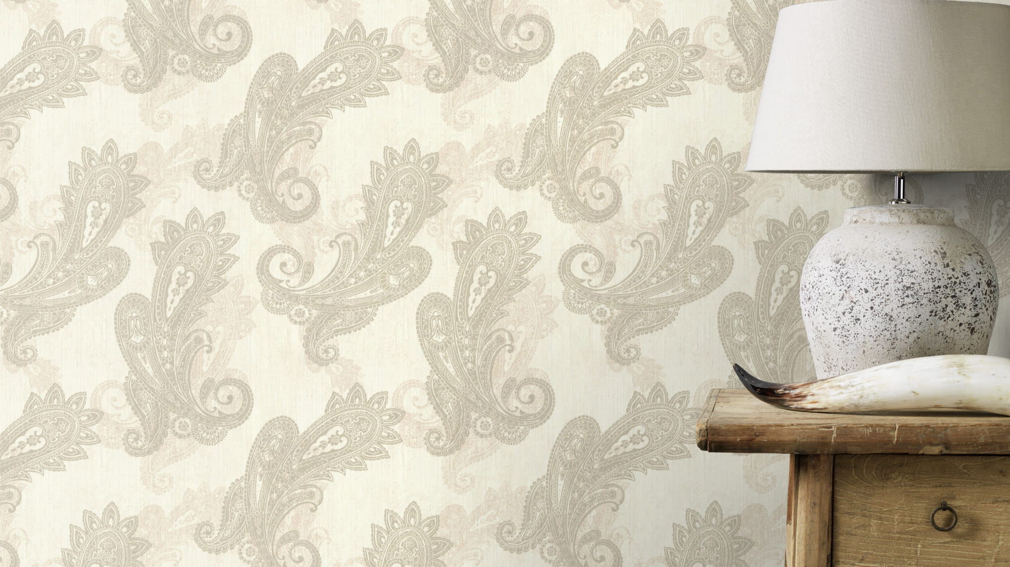 Tapeta w wzór paisley, inspirowana indyjskimi nadrukami. Projekt jest ukazany zarówno w stonowanych, jak i kontrastowych i odważnych zestawieniach kolorów. Doskonale sprawdzi się, jako dekoracja salonu, sypialni oraz pokoju dziennego. Motyw paisley z całą pewnością stworzy wyraźny akcent we wnętrzach zaaranżowanych w orientalnym stylu.