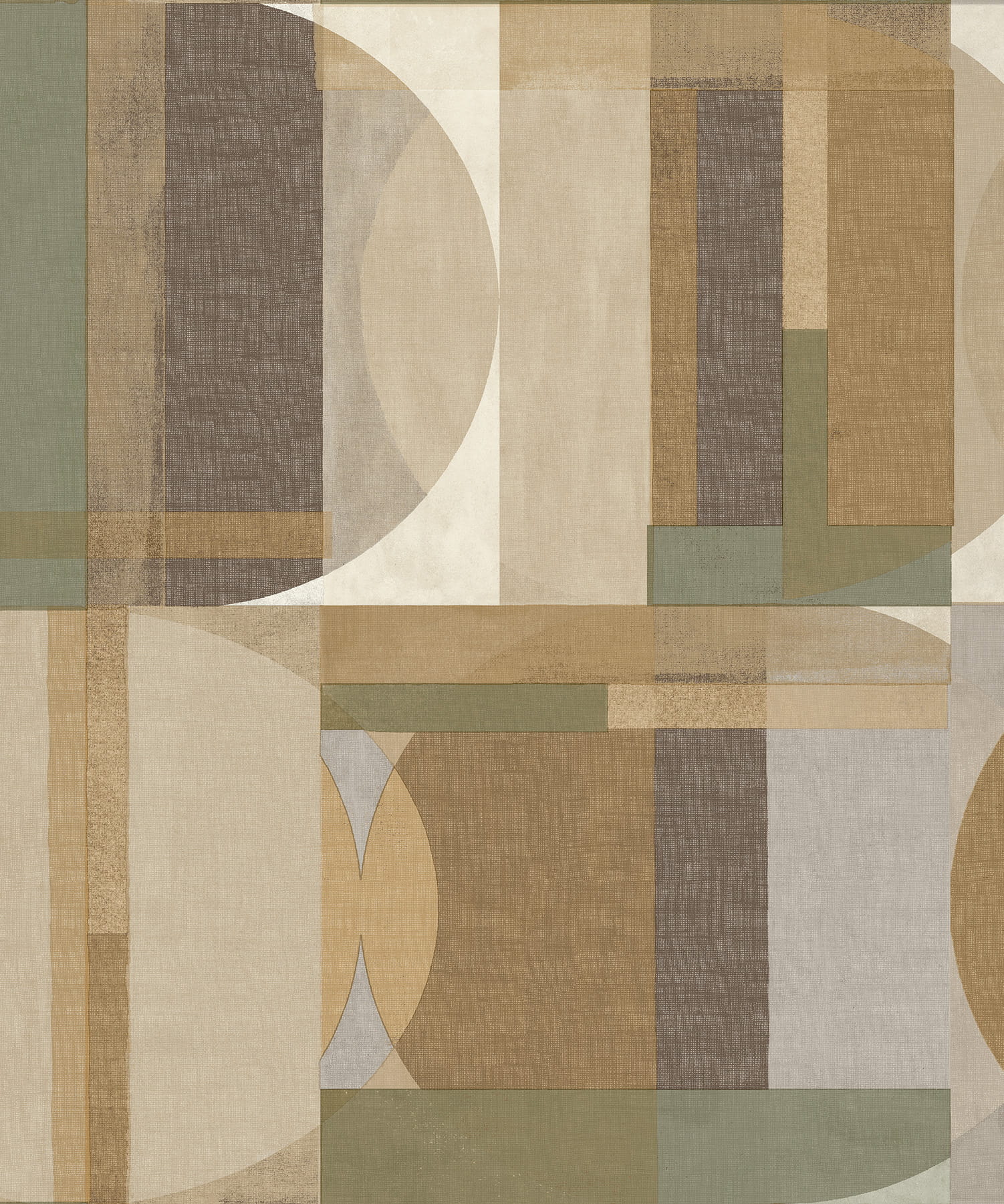 Prezentowana tapeta ścienna z kolekcji "Arcadia", od Grandeco wyróżnia się oryginalnym, geometrycznym wzorem, zainspirowanym stylem retro. Motyw składa się z prostych form o zaokrąglonych krawędziach, które przypominają koła i prostokąty, przenikających się nawzajem i tworzących harmonijną kompozycję. Kolorystyka jest stonowana, bazująca na naturalnych odcieniach ziemi – beżu, brązu, szarości, oliwkowej zieleni i bieli. Delikatna struktura tapety imituje płótno o matowym wykończeniu, co wzmacnia przytulny i naturalny charakter kompozycji.