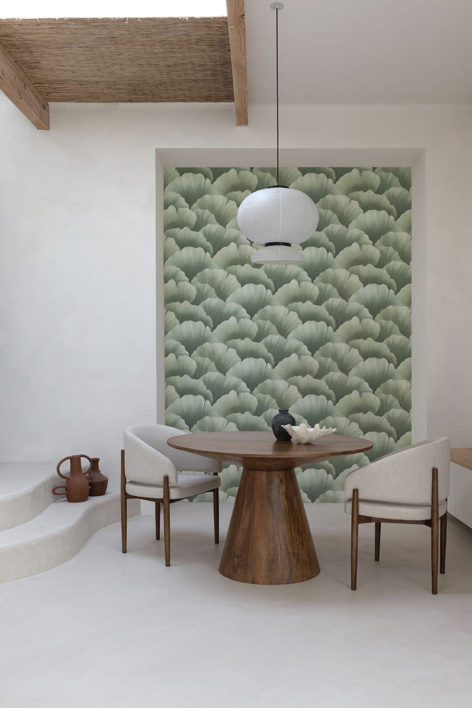 Powyższa tapeta z motywem roślinnym doskonale sprawdzi się przy aranżacji nowoczesnego wnętrza. Motyw przedstawiający liście o dużej i fantazyjnej formie w wyjątkowy sposób odmieni styl salonu, jadalni, sypialni, czy też przedpokoju. Kolorystyka tapety, będąca zestawieniem spokojnych odcieni zieleni sprawia, że kompozycja ma przytulny i naturalny charakter. Struktura tapety jest delikatnie tłoczona, z widocznymi i wyczuwalnymi pod palcem, cieniutkimi prążkami, które wypełniają liście. Tłoczenie to sprawia, że tapeta delikatnie się mieni, co przyciąga wzrok. Powierzchnia tapety jest miękka, gąbczasta w dotyku. Wykończenie na pierwszy rzut oka zdaje się być matowe, jednak powierzchnia lśni szampańskim, perłowym pyłkiem, co pięknie uwidacznia się pod wpływem padania światła słonecznego, mocniej lśnią jaśniejsze elementy. Tapeta pochodzi z ekskluzywnej kolekcji „Belize”, producenta Grandeco. Jest tapetą winylową na podłożu flizelinowym, odporną na szorowanie a co za tym idzie, łatwą do utrzymaniu w czystości.