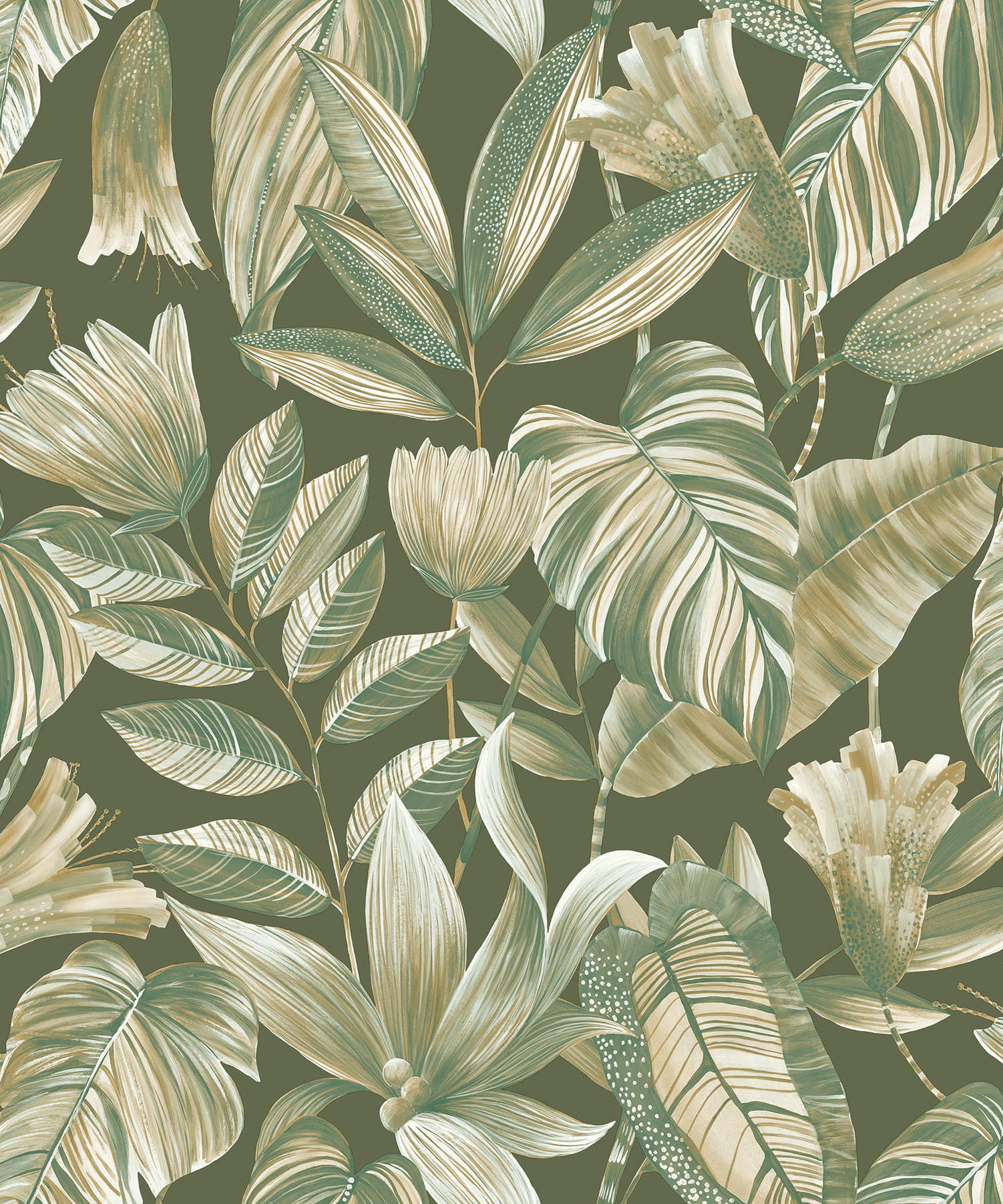 Powyższa tapeta z motywem roślinnym z pewnością będzie pomocna przy tworzeniu przytulnej aranżacji wnętrza. Kwiaty i liście przyciągają wzrok dużą formą i sprawiają wrażenie malowanych pędzlem. Ciemne, oliwkowe tło wypełnia wzór w odcieniach zieleni, brązu, beżu oraz bieli i szarości. Struktura tapety jest gładka, nieco ziarnista w dotyku a wykończenie matowe. Tapeta doskonale sprawdzi się w postaci dekoracji jednej ściany, tworząc spójne zestawienie z tapetami prezentowanymi poniżej. Gwarantuje efektowny wystrój nowoczesnego salonu, jadalni, czy też sypialni. Świetnie sprawdzi się też w dużym przedpokoju. Tapeta pochodzi z ekskluzywnej kolekcji „Belize”, producenta Grandeco. Jest tapetą winylową na podłożu flizelinowym, odporną na szorowanie a co za tym idzie, łatwą do utrzymaniu w czystości.