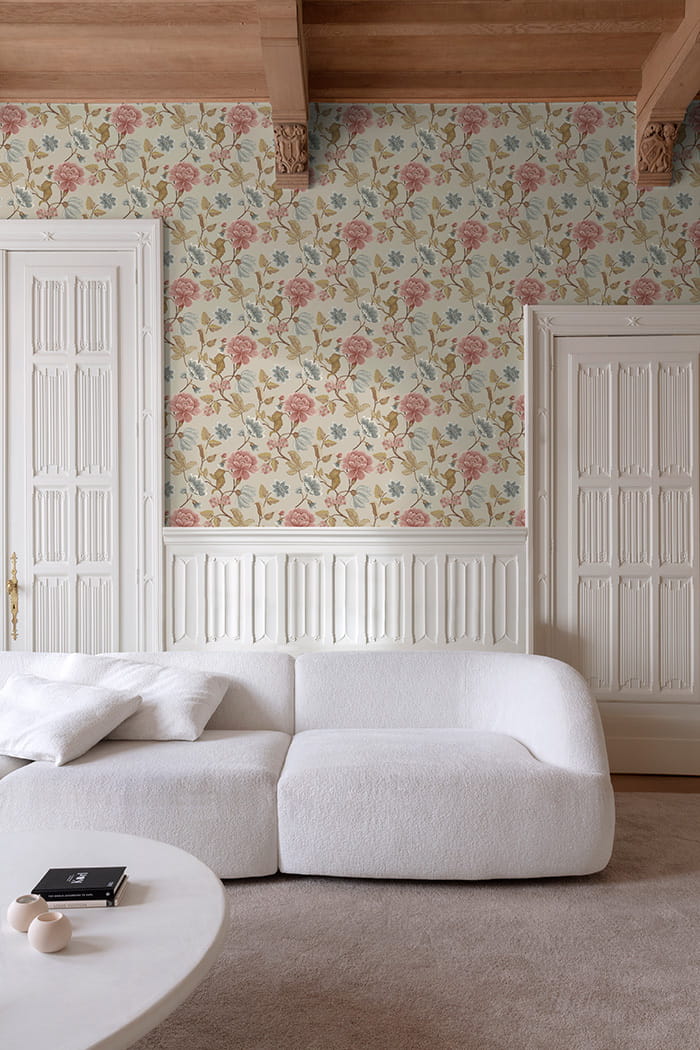 Prezentowana tapeta ścienna o numerze IC3116 wyróżnia się delikatnym motywem kwiatowym, inspirowanym malarstwem Wiliama Morrisa. Bogaty, florystyczny wzór przedstawiający duże, stylizowane kwiaty na wijących się gałązkach z listkami emanuje klasycznym stylem i elegancją. Pastelowe, przygaszone barwy nadają tapecie subtelny i harmonijny wygląd i sprawiają, że kompozycja prezentuje się bardzo przytulnie. Wzór w spokojnych tonacjach różu, ciepłego brązu i szarości, z akcentami bieli został wyeksponowany na delikatnym tle w tonacji jasnego, szarego beżu. Delikatna struktura tapety jest gładka, lekko ziarnista a jej wykończenie matowe. Tapeta świetnie będzie współgrać zarówno z klasycznymi, jak i nowoczesnymi aranżacjami. Idealnie pasuje do wnętrz inspirowanych stylem romantycznym i rustykalnym. W wyjątkowy sposób odmieni charakter salonu, czy tez sypialni, nadając każdemu pomieszczeniu przytulny i elegancki wygląd. Tapeta pochodzi z kolekcji "Icon", belgijskiego producenta Grandeco. Projekt jest dostępny w czterech wersjach kolorystycznych. Podłoże tapety winylowe na flizelinie, odporne na szorowanie, dzięki czemu utrzymanie tapety w czystości nie będzie stanowiło problemu.