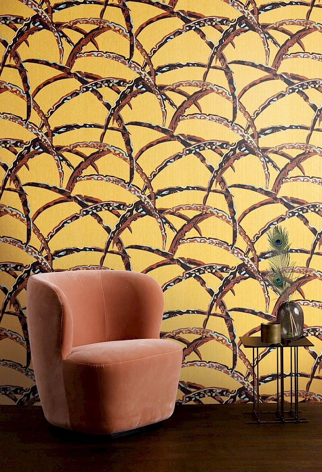 Tapeta Khroma Kimono KIM502 Daika Autumn inspiruje swoją wszechstronnością i oryginalnym wzorem. Zaprezentowane na powierzchni kolorowe liście zaskakują swoją wielkością i rozpiętością, mogą przywodzić na myśl jesienny krajobraz pełen naturalnych barw i tekstur. Na liściach znajdują się nieregularnie rozmieszczone płatki kwiatów, co dodatkowo pozwala interpretować ten wzór na różne, abstrakcyjne sposoby. Tapeta ścienna wykonana w japońskim stylu, będzie doskonałą ozdobą dla salonu lub sypialni, dodając wnętrzu subtelnej, orientalnej atmosfery. Wyszukana kolorystyka, dodatkowo podkreśla unikatowość tej tapety. Zaprezentowane połączenie czarnego z turkusowym i ceglasto-brązowymi tonacjami, pięknie prezentuje się na żółtym tle. Matowe wykończenie tworzy atmosferę naturalnego spokoju i harmonii. Jednak z bliska można dostrzec na tle tapety pionowe niteczki, wypełnione mieniącymi się pod wpływem światła drobinkami, co dodatkowo czyni ją bardziej wyjątkową. Sprawdzi się, jako samodzielna dekoracja ścian lub zestawiona z szeroką gamą wzorów z kolekcji Kimono, stworzy niesamowitą aranżację. Struktura tapety jest jednolita i przypomina w dotyku płótno tkaniny. Tapeta flizelinowa, charakteryzuje się dobrą odpornością na zmywanie, wierzch można bardzo delikatnie przecierać ściereczką.