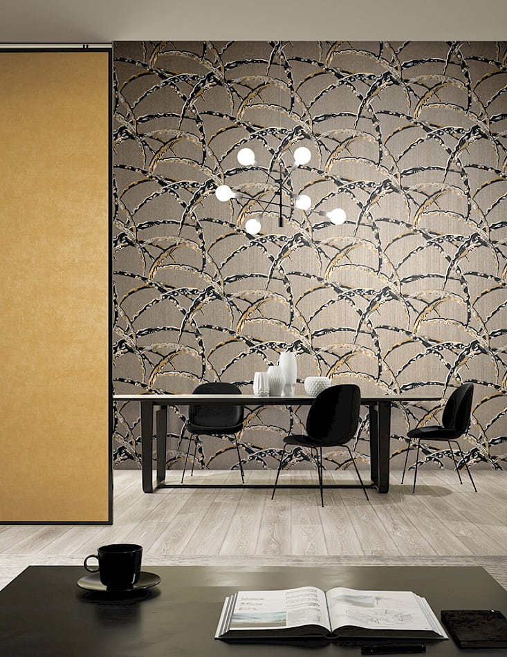 Tapeta Khroma Kimono KIM503 Daika Gold inspiruje swoją wszechstronnością i oryginalnym wzorem. Zaprezentowane na powierzchni kolorowe liście zaskakują swoją wielkością i rozpiętością, mogą przywodzić na myśl jesienny krajobraz pełen naturalnych barw i tekstur. Na liściach znajdują się nieregularnie rozmieszczone płatki kwiatów, co dodatkowo pozwala interpretować ten wzór na różne, abstrakcyjne sposoby. Tapeta ścienna wykonana w japońskim stylu, będzie doskonałą ozdobą dla salonu lub sypialni, dodając wnętrzu subtelnej, orientalnej atmosfery. Wyszukana kolorystyka, dodatkowo podkreśla unikatowość tej tapety. Zaprezentowane połączenie czarnego z złotym oraz różnorodnymi tonacjami beżowego i popielatego, pięknie prezentuje się na brązowym tle. Matowe wykończenie tworzy atmosferę naturalnego spokoju i harmonii. Jednak z bliska można dostrzec na tle tapety pionowe niteczki, wypełnione mieniącymi się pod wpływem światła drobinkami, co dodatkowo czyni ją bardziej wyjątkową. Sprawdzi się, jako samodzielna dekoracja ścian lub zestawiona z szeroką gamą wzorów z kolekcji Kimono, stworzy niesamowitą aranżację. Struktura tapety jest jednolita i przypomina w dotyku płótno tkaniny. Tapeta flizelinowa, charakteryzuje się dobrą odpornością na zmywanie, wierzch można bardzo delikatnie przecierać ściereczką.