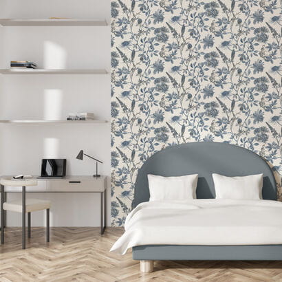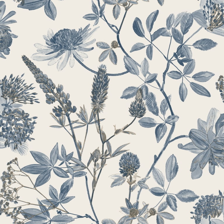 Wzór roślinny występuje w kilku w tonacjach niebieskiego. Kwiaty z łodygami zostały lekko wzbogacone metalicznymi akcentami w kolorze szampańskim. Kolorystyka tła jest zachowania w odcieniu wełnianej bieli. Struktura tapety jest jednolita na całej powierzchni, w dotyku przypomina tkaninę o delikatnym i płóciennym splocie.