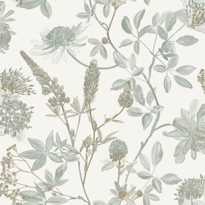Wzór roślinny występuje w kilku w tonacjach szarej zieleni. Kwiaty z łodygami zostały lekko wzbogacone metalicznymi akcentami w kolorze szampańskim. Kolorystyka tła jest zachowania w odcieniu wełnianej bieli. Struktura tapety jest jednolita na całej powierzchni, w dotyku przypomina tkaninę o delikatnym i płóciennym splocie.