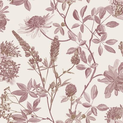 Wzór roślinny występuje w kilku w tonacjach bordowo-różowych. Kwiaty z łodygami zostały lekko wzbogacone metalicznymi akcentami w kolorze szampańskim. Kolorystyka tła jest zachowania w odcieniu wybielonego pudrowego różowego. Struktura tapety jest jednolita na całej powierzchni, w dotyku przypomina tkaninę o delikatnym i płóciennym splocie.