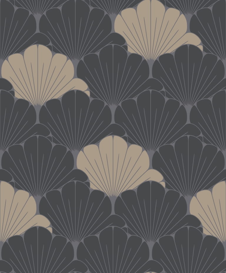 Tapeta z motywem roślinnym na kształt liści miłorzębu, przypominających wyglądem rozłożone wachlarze. Wzór gęsto wypełnia powierzchnię tła, które jest niemalże niewidoczne. Jego funkcję pełnią kontury liści oraz ich ogonki. Doskonała propozycja dla miłośników niebanalnych i nowoczesnych rozwiązań w loftowym stylu. Dzięki swoim metalicznym wykończeniom doda elegancji wnętrzu.