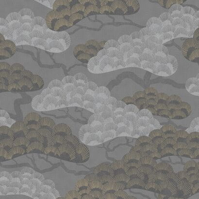 Tapeta z roślinnym motywem naśladującym korony drzew, połączonych miedzy sobą minimalistycznymi pniami, na wzór drzewka bonsai. Wzór gęsto wypełnia powierzchnię tła. Korony drzew występują w odcieniach jasnego szarego i grafitowego, tworząc efektywny kontrast. Na tle okazałego listowia, można dostrzec równe i regularne kreseczki w odcieniach szarego oraz metalicznego srebrnego, które mogą przypominać małe gałązki.