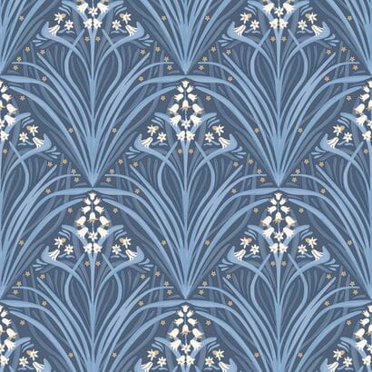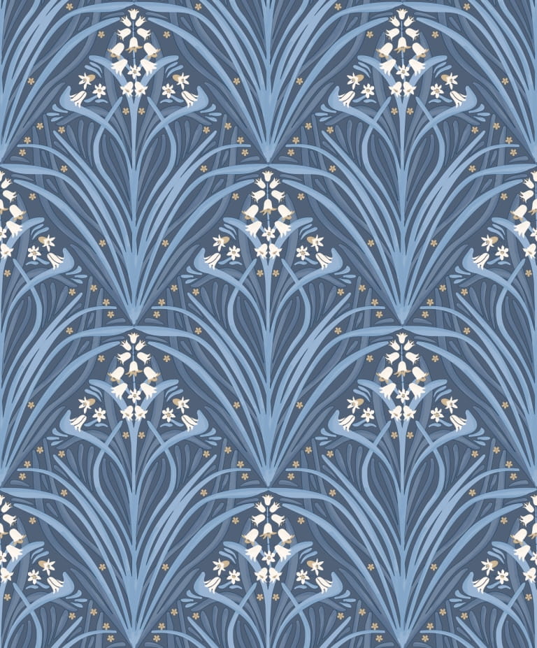 Tapeta z dużym i okazałym motywem kwiatowym, skomponowanym na wzór ornamentu. Wijące się długie listki, tworzą duże bukiety roślinne, gęsto wypełniając powierzchnię tła. Listki występują w odcieniach granatowego i niebieskiego, tworząc efektywny kontrast. Ornament został wzbogacony drobnymi, białymi kwiatuszkami w kształcie dzwoneczków, zaakcentowanych metalicznymi- złotymi elementami, które wprowadzają na tapecie nutę elegancji.