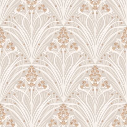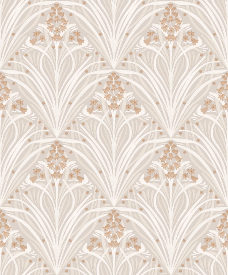 Tapeta z dużym i okazałym motywem kwiatowym, skomponowanym na wzór ornamentu. Wijące się długie listki, tworzą duże bukiety roślinne, gęsto wypełniając powierzchnię tła. Listki występują w odcieniach beżowego i białego, tworząc efektywny kontrast. Ornament został wzbogacony drobnymi, brązowymi kwiatuszkami w kształcie dzwoneczków, zaakcentowanych metalicznymi- złotymi elementami, które wprowadzają na tapecie nutę elegancji.