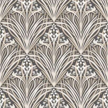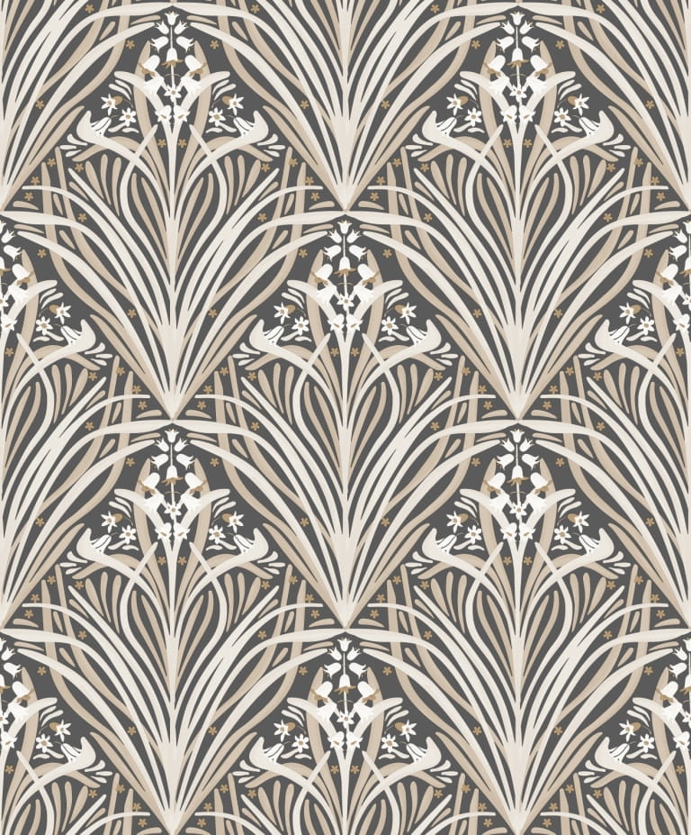 Tapeta z dużym i okazałym motywem kwiatowym, skomponowanym na wzór ornamentu. Wijące się długie listki, tworzą duże bukiety roślinne, gęsto wypełniając powierzchnię tła. Listki występują w odcieniach jasnego i ciemnego beżowego, tworząc efektywny kontrast. Ornament został wzbogacony drobnymi, białymi kwiatuszkami w kształcie dzwoneczków, zaakcentowanych metalicznymi- złotymi elementami, które wprowadzają na tapecie nutę elegancji.