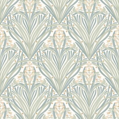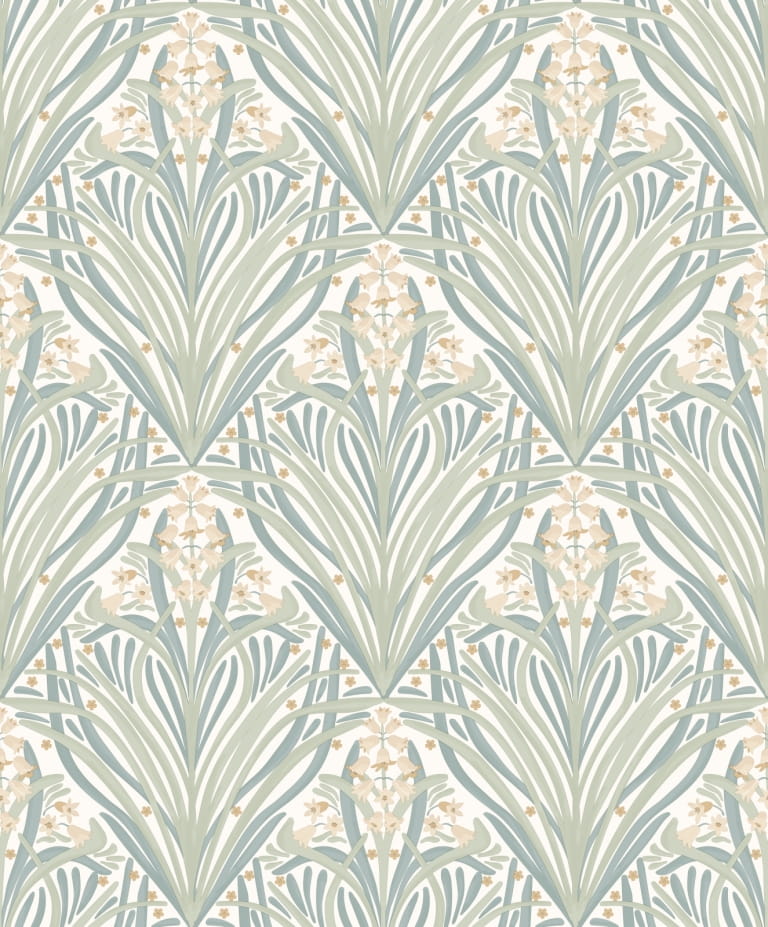 Tapeta z dużym i okazałym motywem kwiatowym, skomponowanym na wzór ornamentu. Wijące się długie listki, tworzą duże bukiety roślinne, gęsto wypełniając powierzchnię tła. Listki występują w odcieniach miętowej zieleni i jasnym turkusowym, tworząc efektywny kontrast. Ornament został wzbogacony drobnymi, beżowymi kwiatuszkami w kształcie dzwoneczków, zaakcentowanych metalicznymi- złotymi elementami, które wprowadzają na tapecie nutę elegancji.