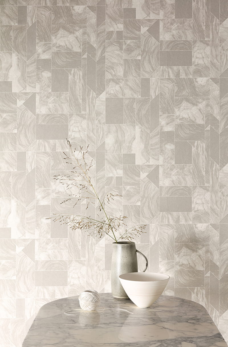 Tapeta Khroma Spirit of Nature SPI704 Thelia Dew imitująca marmur to doskonały pomysł na dekorację wnętrz w różnych stylach aranżacyjnych, takich jak nowoczesne, współczesne czy industrialne. Marmur został zaprezentowany w formie zgeometryzowanych kafelek, podzielonych cienką fugą, pokrytą srebrnymi drobinkami. Całość tworzy intrygującą mozaikę pełną wielobarwnych oraz nieregularnych żyłek. Kolorystyka została zachowana w odcieniach jasnego i ciemnego popielatego oraz białego. Matowe wykończenie tapety dodatkowo stworzy w pomieszczeniu spokojny klimat oraz będzie uniwersalną bazą dla pozostałych dodatków i dekoracji. Tapeta w marmur, idealnie wpasuje się w wystrój salonu, jadalni, sypialni nadając im niepowtarzalny i pełen energii charakter. Sprawdzi się, jako samodzielna dekoracja ścian lub zestawiona z szeroką gamą wzorów z kolekcji Spirit of Nature, stworzy niesamowitą aranżację. Powierzchnia tapety jest niemalże gładka w dotyku z lekką wyczuwalną wypukłością na połyskującej fudze. Tapeta flizelinowa, charakteryzuje się dobrą odpornością na zmywanie, wierzch można bardzo delikatnie przecierać ściereczką.