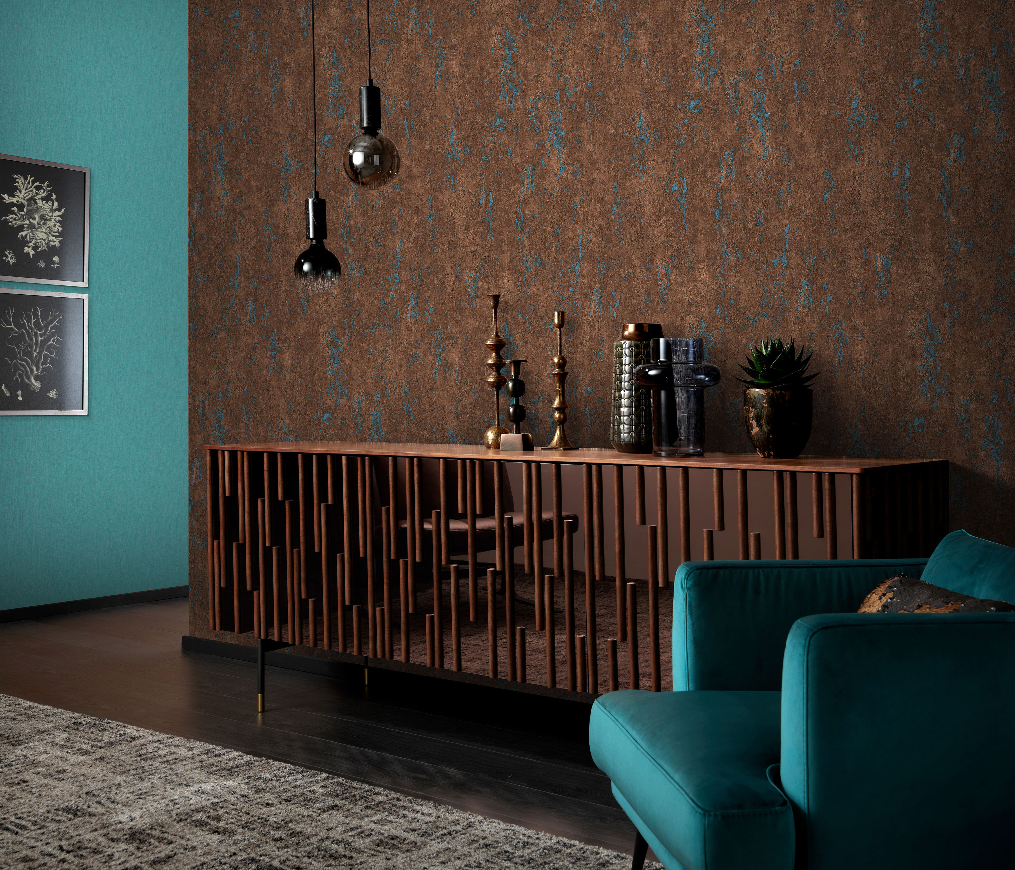 Tapeta imitująca dekoracyjny kamień ścienny w kolorze miedzianego brązu, z akcentami metalizowanego turkusu. Delikatny połysk koloru niebieskiego dodaje całości wyszukanego stylu i sprawia, że tapeta pięknie się mieni. Struktura tapety jest delikatnie tłoczona, chropowata w dotyku. Tapeta z powodzeniem może stanowić samodzielną dekorację całego pomieszczenia, jak i tworzyć modne zestawienie z innymi produktami z kolekcji. Doskonale sprawdzi się przy aranżacji nowoczesnego wnętrza, świetnie pasuje do każdego pomieszczenia. Tapeta na podłożu flizelinowym, zmywalna. Pochodzi z kolekcji "Fashion for Walls 4", którą przy współpracy z producentem Erismann zaprojektował Guido Maria Kretchmer.