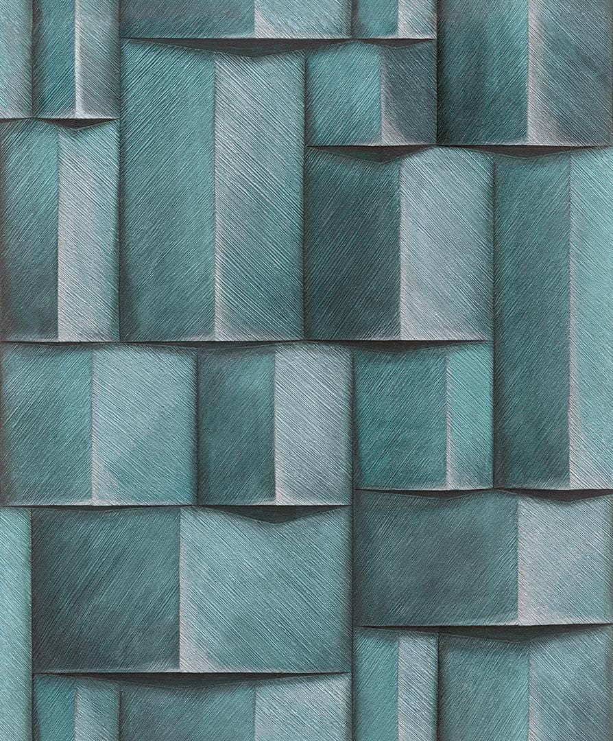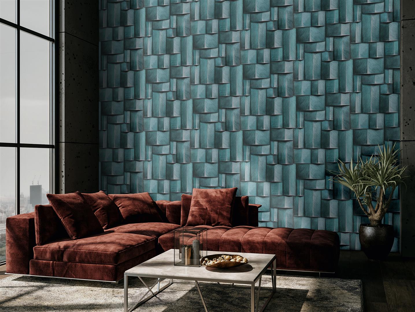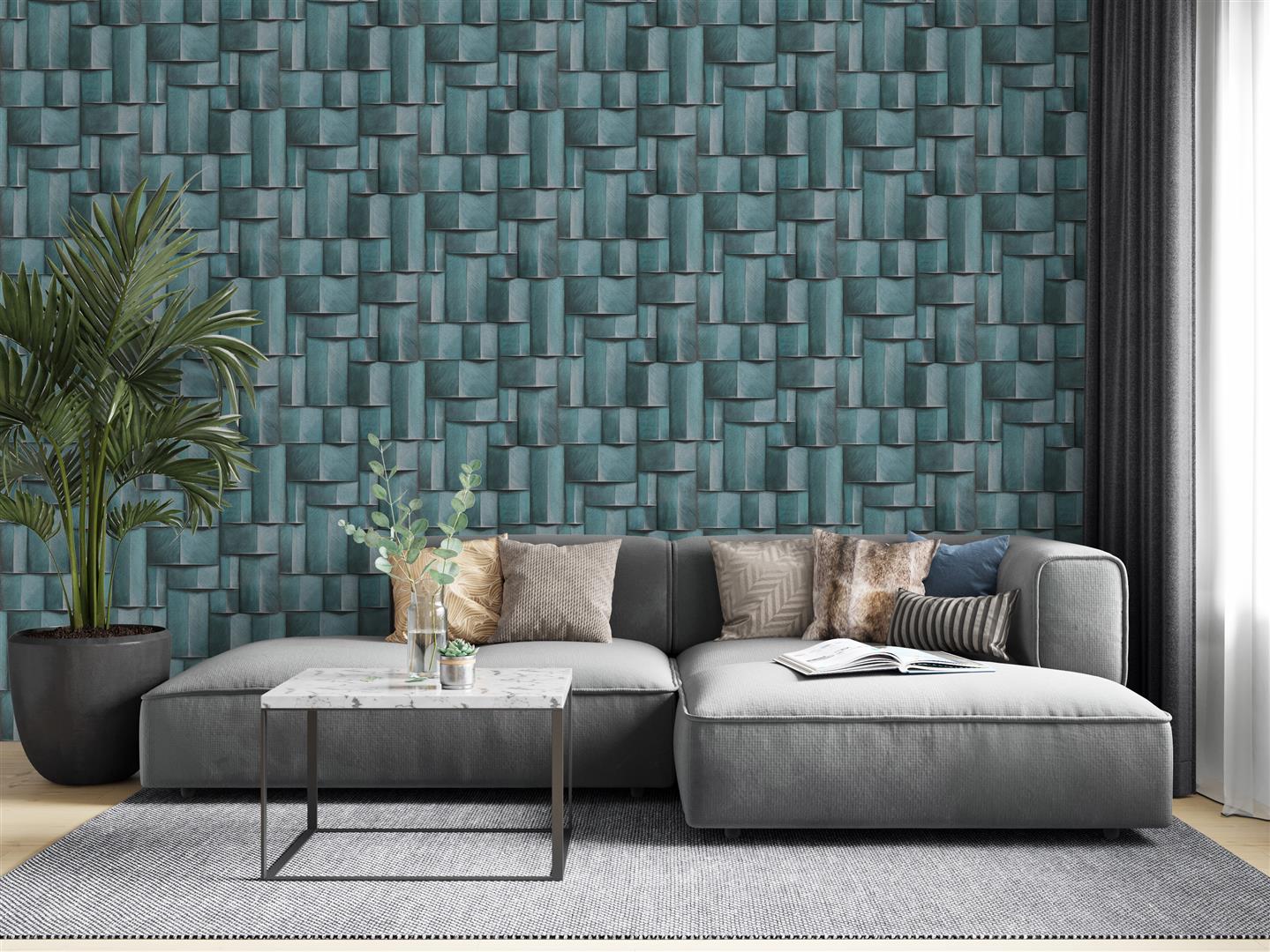 Prezentowaną tapetę ścienną wyróżnia trójwymiarowy, geometryczny wzór z efektem trójwymiarowości, inspirowany strukturą naturalnego drewna. Motyw składa się z prostokątnych elementów tworzących iluzję paneli, które delikatnie odstają od ściany, tworząc efekt głębi i przestrzenności. Kolorystyka tapety oscyluje wokół zgaszonych odcieni turkusu przechodzących w szarawe tony, które nadają tapecie wyrazisty charakter. Tapeta ma delikatnie tłoczoną, prążkowaną strukturę, która wzmacnia efekt drewnianej powierzchni, wykończenie tapety jest matowe. Oryginalny wzór z efektem 3D to doskonały wybór dla osób, ceniących nowoczesne rozwiązania aranżacyjne i wszystkich, tych, którzy marzą o eleganckim i przytulnym wnętrzu. Doskonale wpasuje się do wnętrz nowoczesnych, minimalistycznych, industrialnych i loftowych. Idealnie nadaje się do salonu, jadalni, sypialni, biura, czy też dużego przedpokoju. Świetnie sprawdzi się jako dekoracja jednej ściany, lub na jej wybranej części, na przykład za sofą czy łóżkiem. Zestawienie tapety z produktami, które prezentujemy poniżej pozwoli uzyskać spójny wystrój ścian. Tapeta pochodzi z ekskluzywnej kolekcji "Timber", niemieckiego producenta Marburg. Podłoże tapety winylowe na flizelinie, zmywalne - odporne na szorowanie.